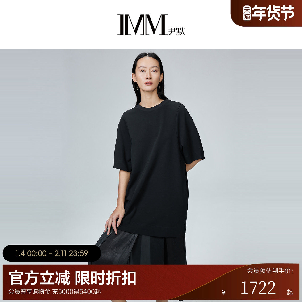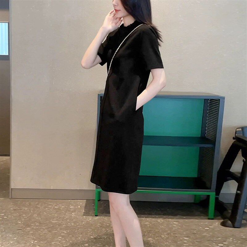 MOVEUP幻走2024春夏纯棉拼接短袖宽松休闲黑色假两件针织连衣裙女