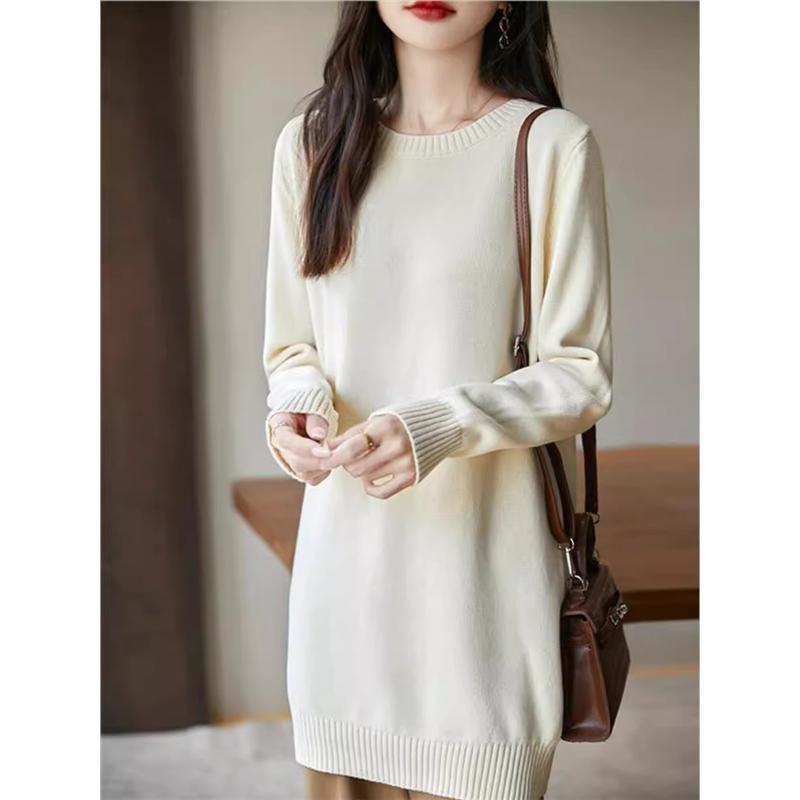 秋冬新款简约风圆领纯棉线针织连衣裙女中长款宽松显瘦打底毛衣裙