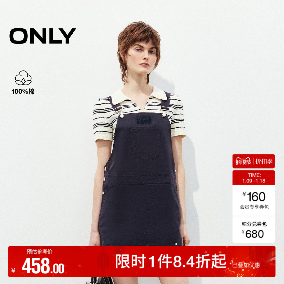 ONLY2025秋冬新款纯棉立体刺绣条纹针织短袖套装直筒背带连衣裙女