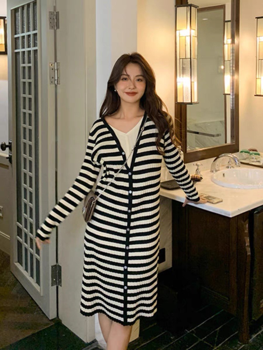 假两件条纹显瘦针织连衣裙高弹纯棉A字裙宽松打底慵懒长袖V领裙女
