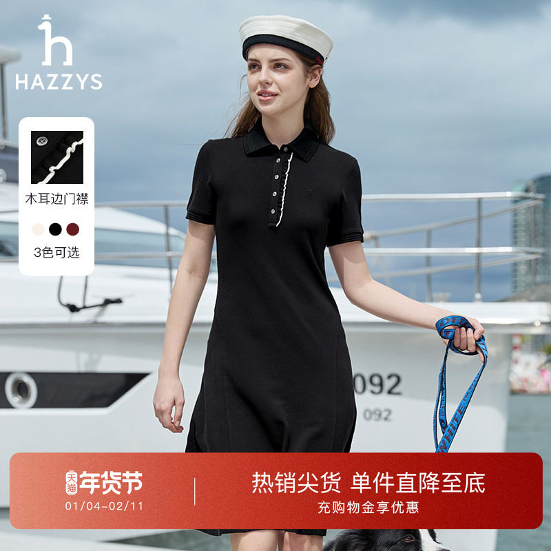【纯棉舒适】Hazzys哈吉斯木耳边POLO短袖针织连衣裙夏季中长款女