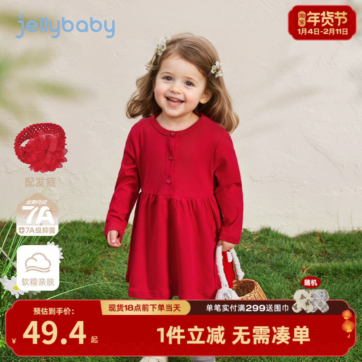 [纯棉抗菌]女童连衣裙秋宝宝红色裙子女小童针织裙秋装儿童公主裙