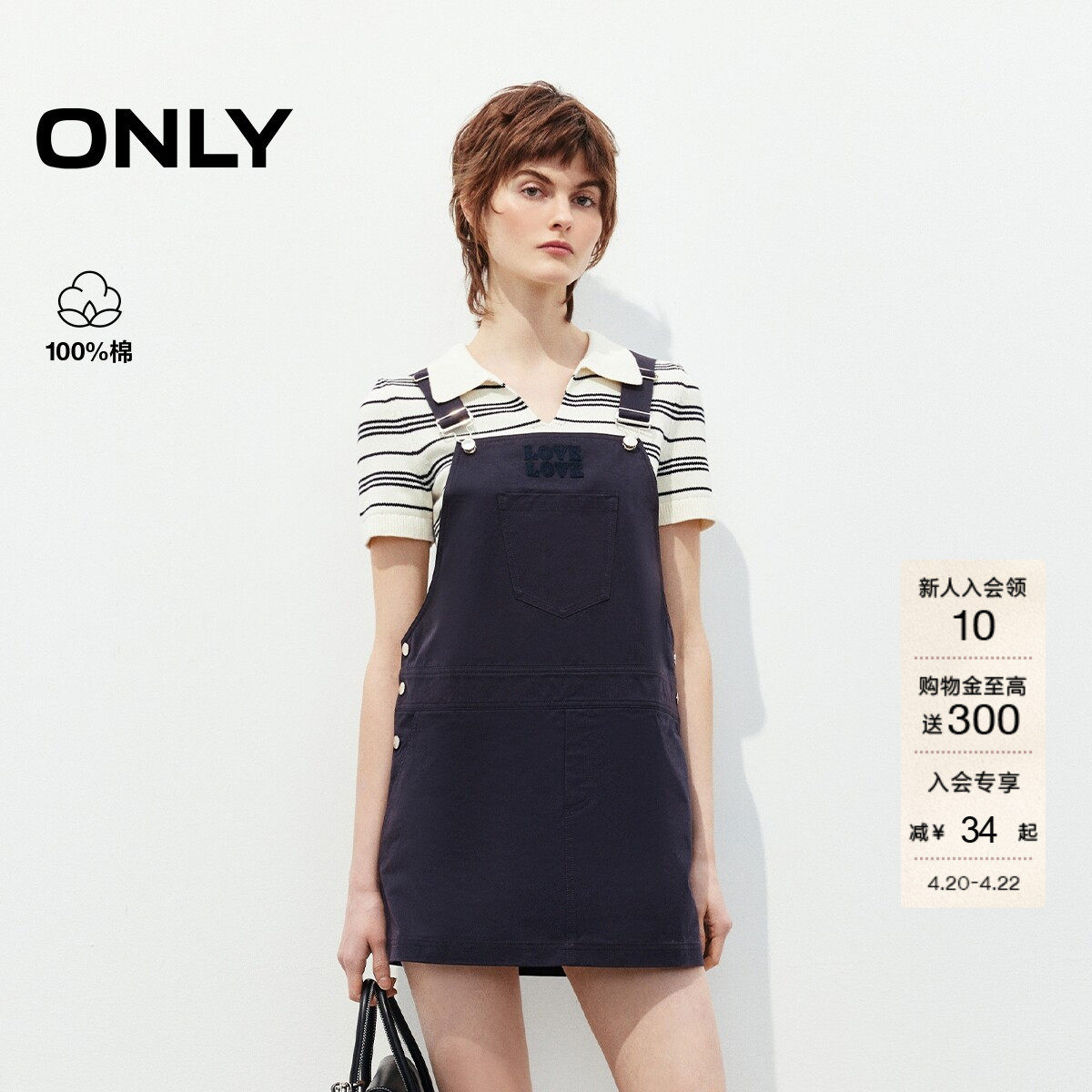【ONLY奥莱】春季纯棉立体刺绣条纹针织短袖套装直筒背带连衣裙女