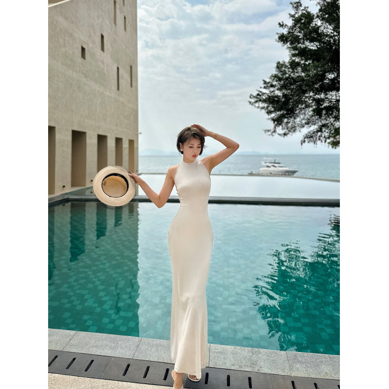 XULU原创夏季气质纯棉针织石膏白挂脖包臀裙性感修身无袖连衣裙