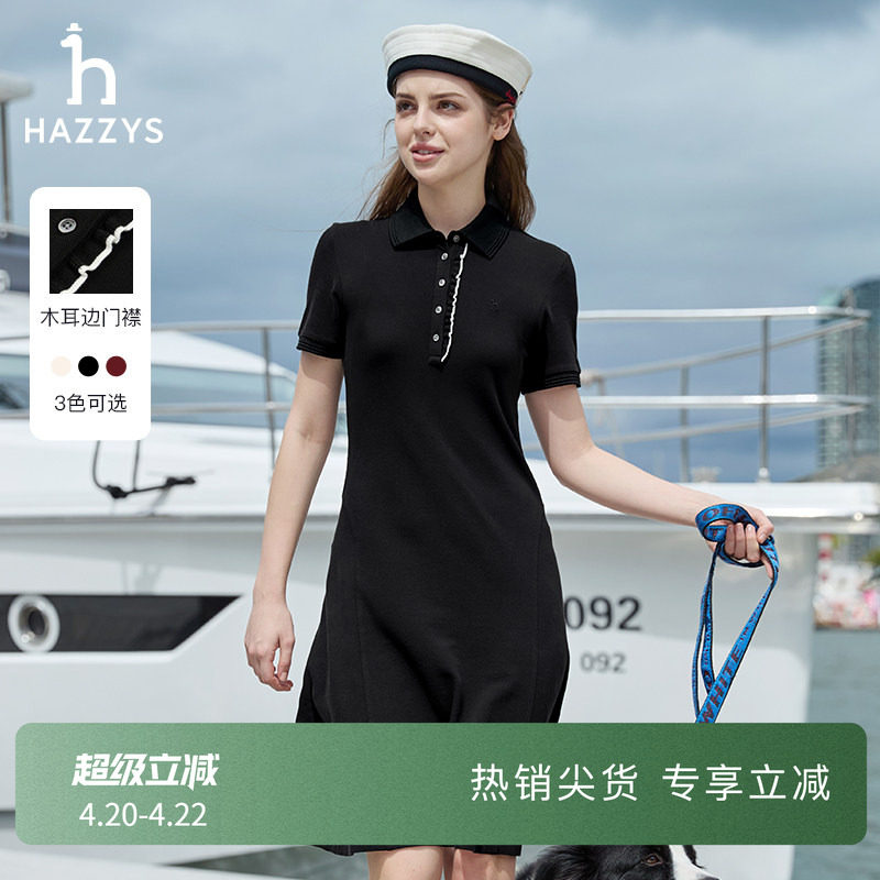 【纯棉舒适】Hazzys哈吉斯木耳边POLO短袖针织连衣裙夏季中长款女