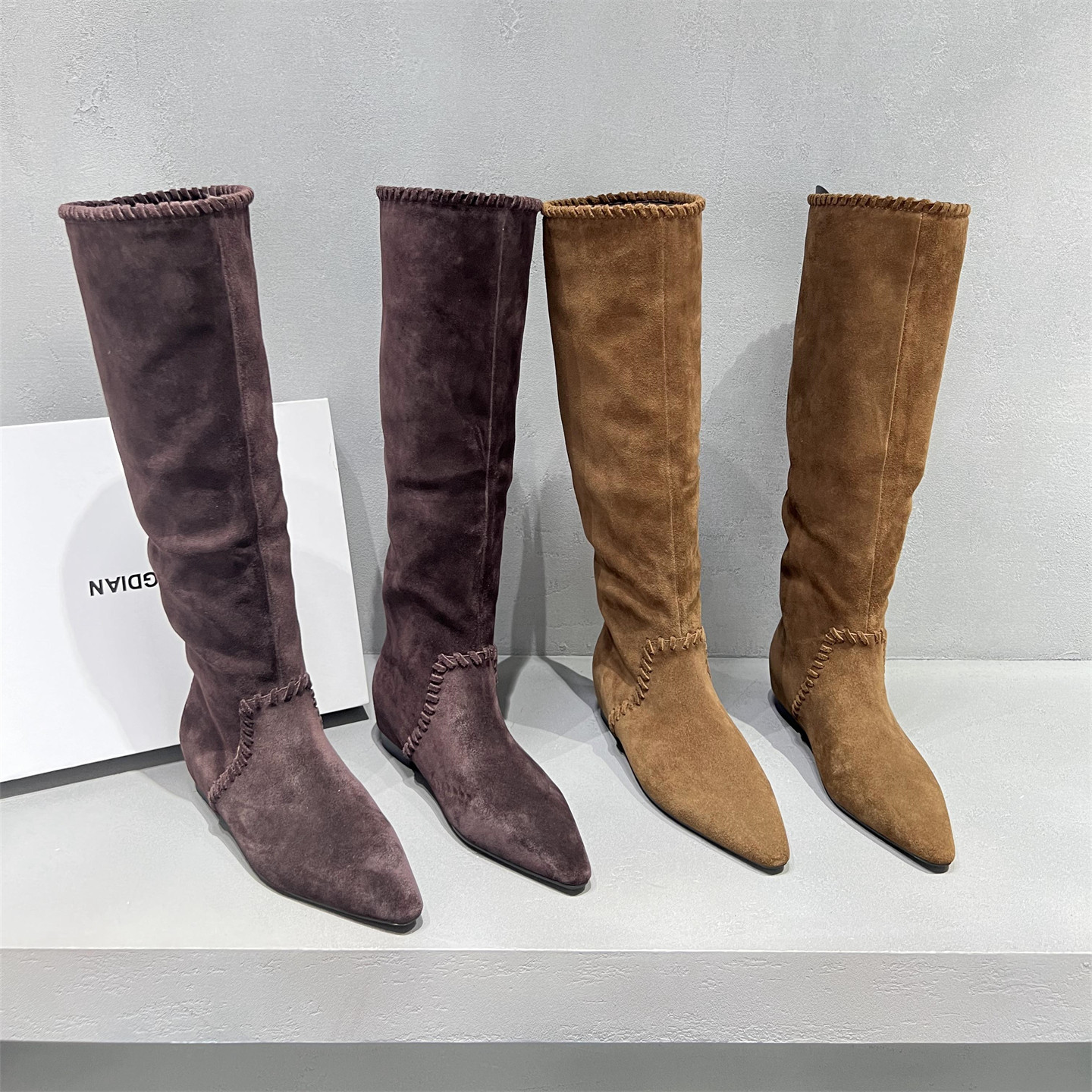 欧洲站女靴2025秋新款欧货真皮磨砂皮尖头平底高筒长靴时装瘦瘦靴