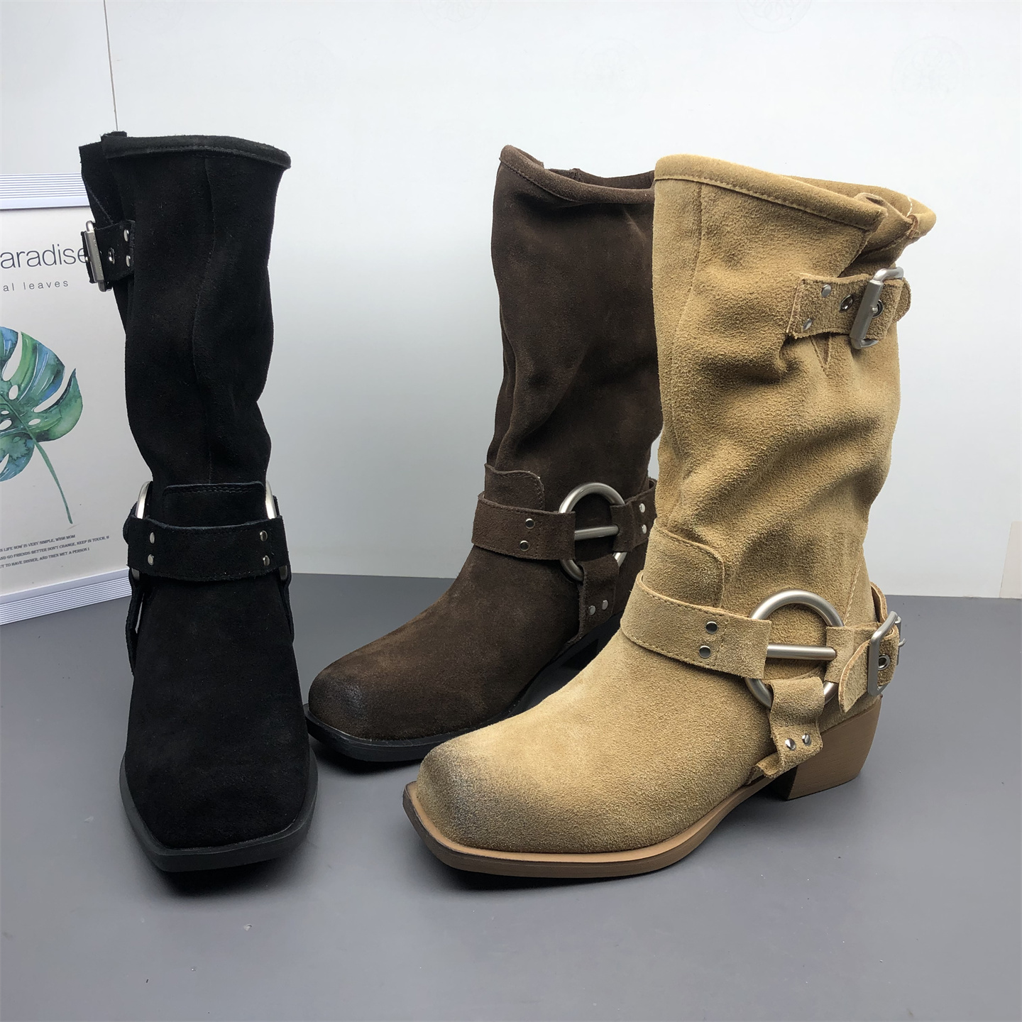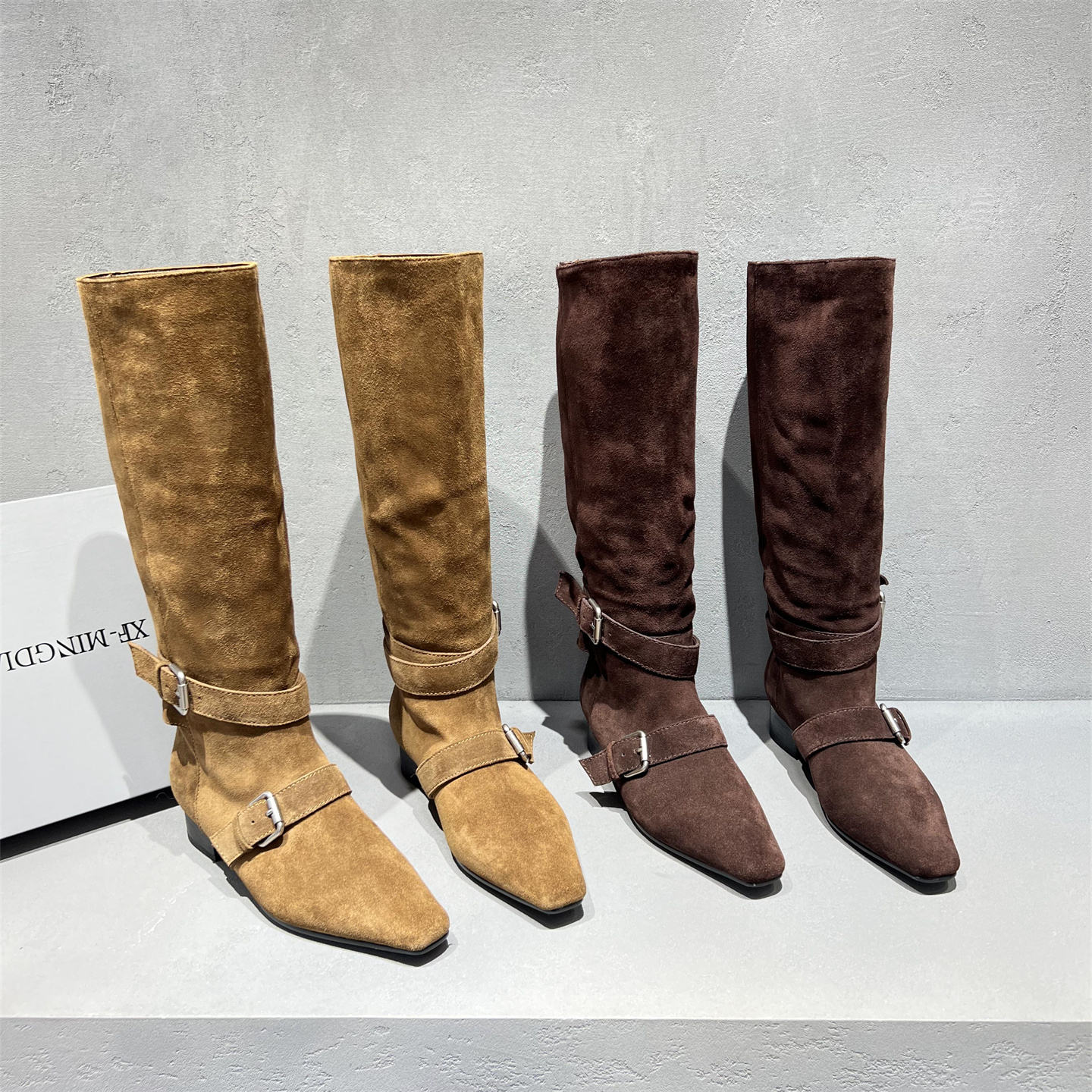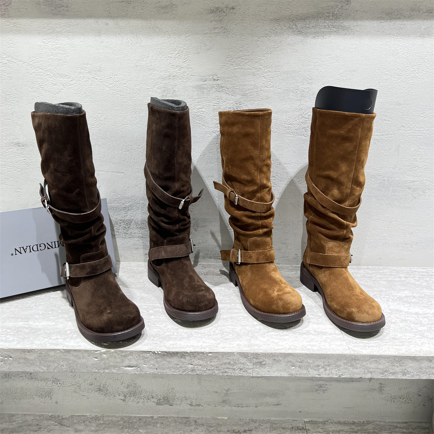 2025秋新款欧洲站真皮女靴尖头休闲磨砂皮皮带扣套筒高筒靴马丁靴