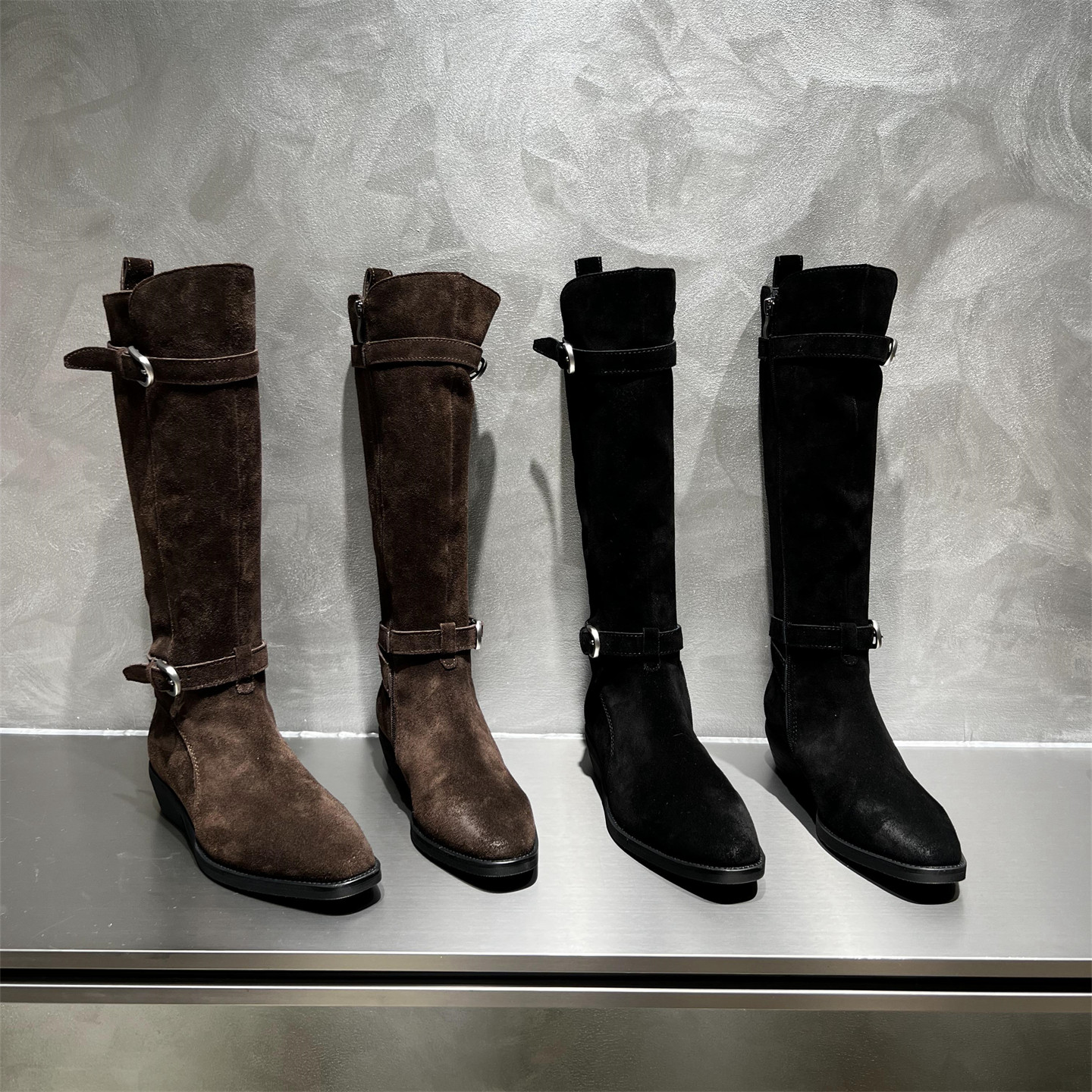 欧洲站女靴2025秋冬新款欧货真皮磨砂皮扣带显瘦高筒长靴骑士靴潮