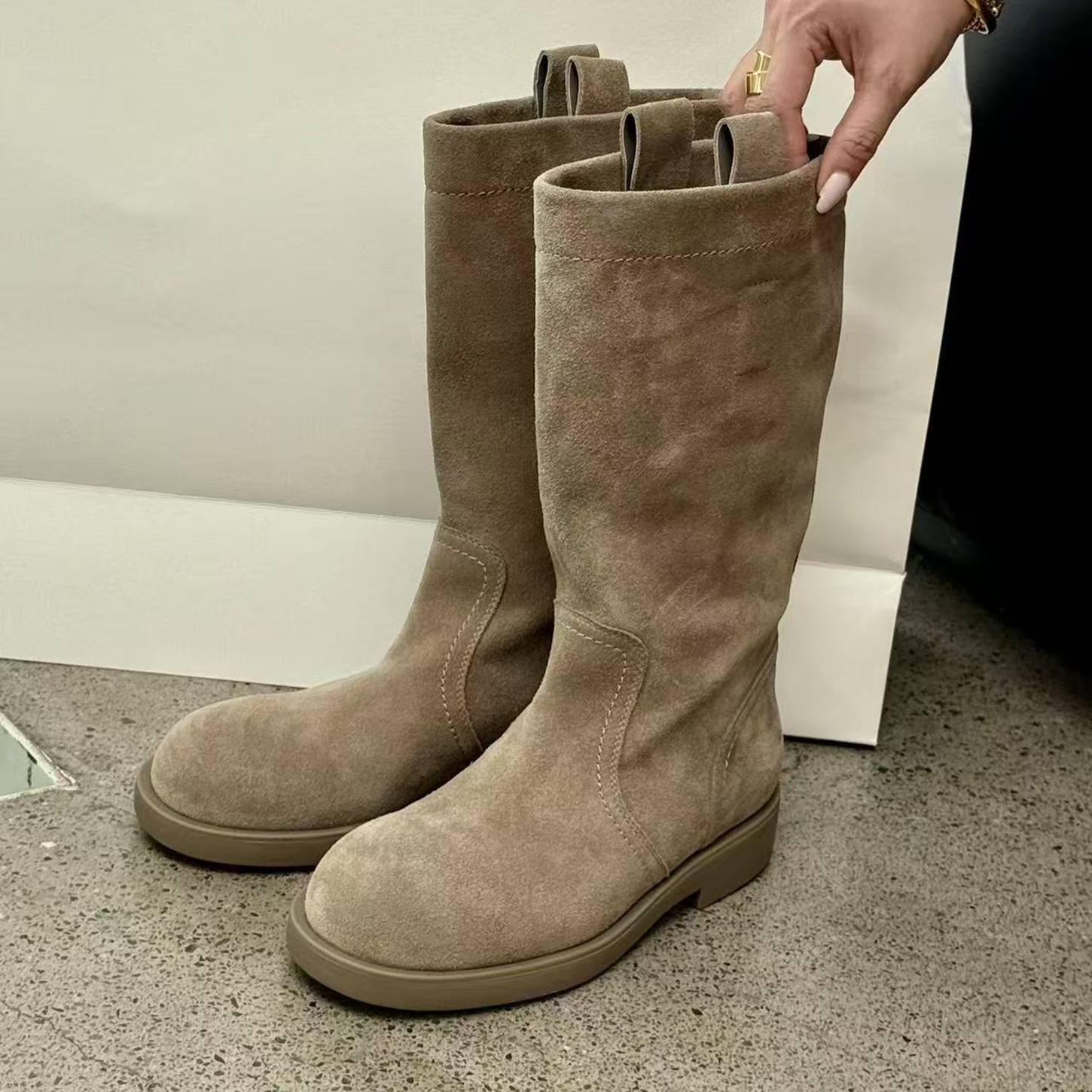 真皮女靴2025新款中筒靴磨砂皮复古长靴欧货不过膝骑士靴春秋单靴