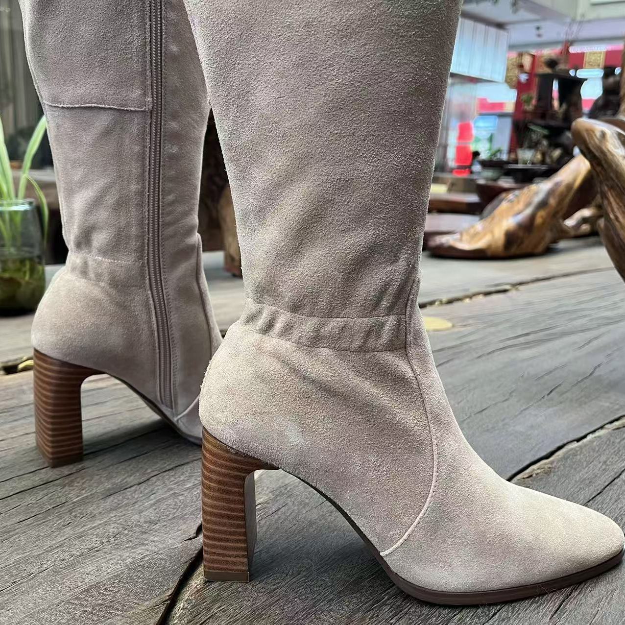 秋冬尖头粗跟牛皮过膝靴中跟真皮绒面磨砂皮长筒靴欧美高跟女靴子