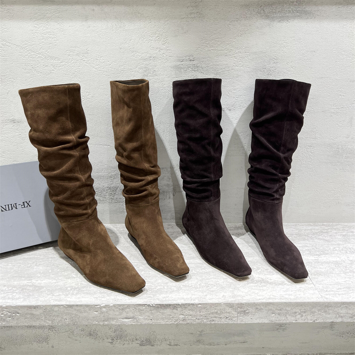 欧洲站女靴2025秋冬新款真皮磨砂皮方头弹力套筒显瘦时装靴高筒靴