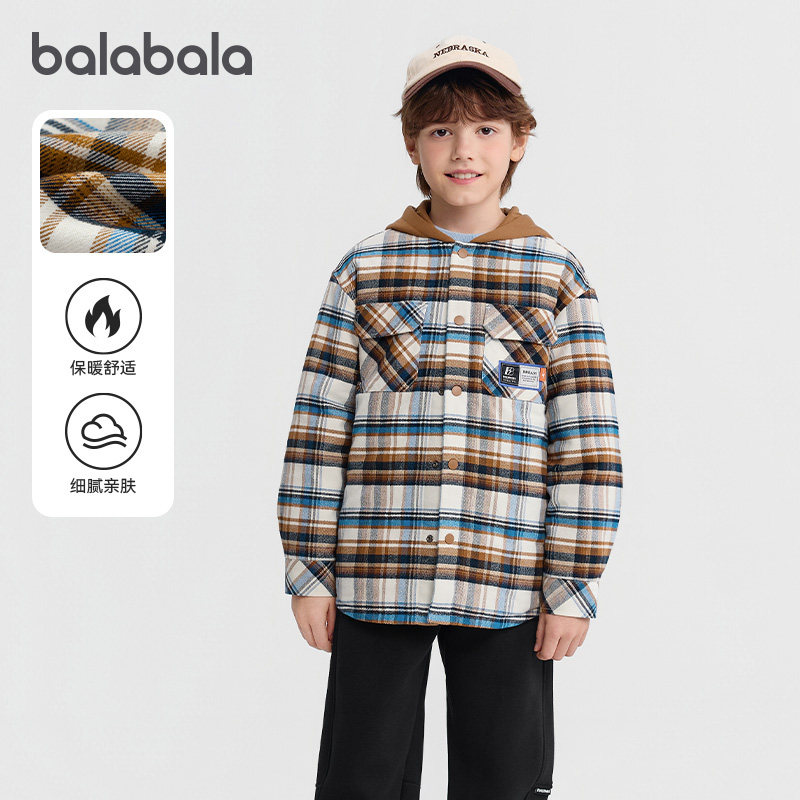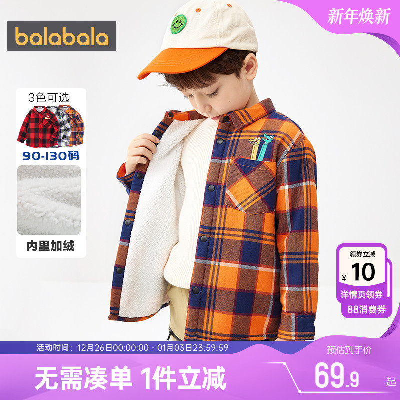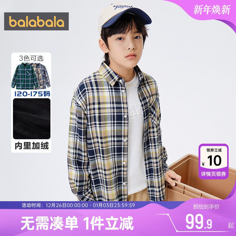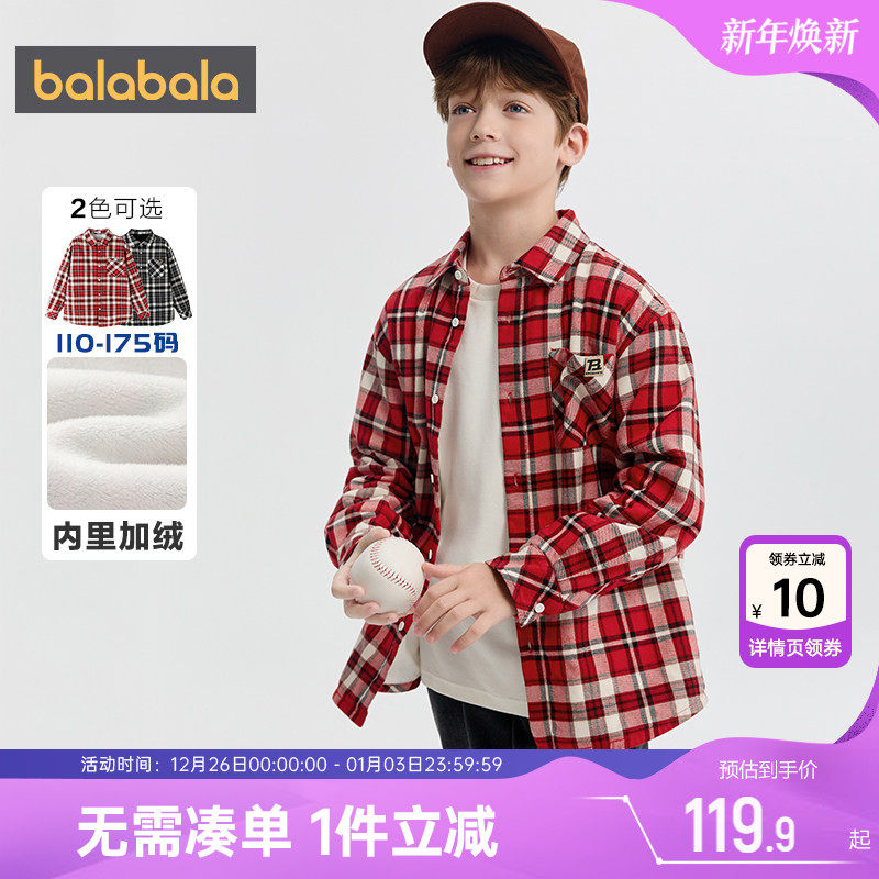 巴拉巴拉男童加绒衬衫儿童格子衬衣中大童长袖上衣冬装新款童装厚