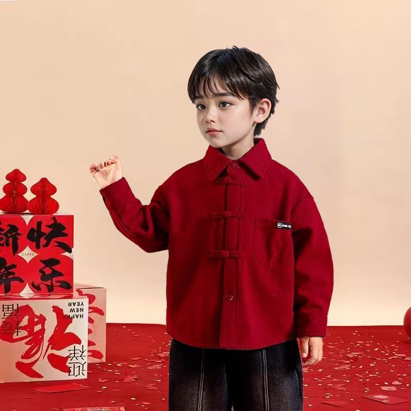 罗蒙男童加绒衬衫儿童新中式唐装拜年服灯芯绒男孩红色过新年外套