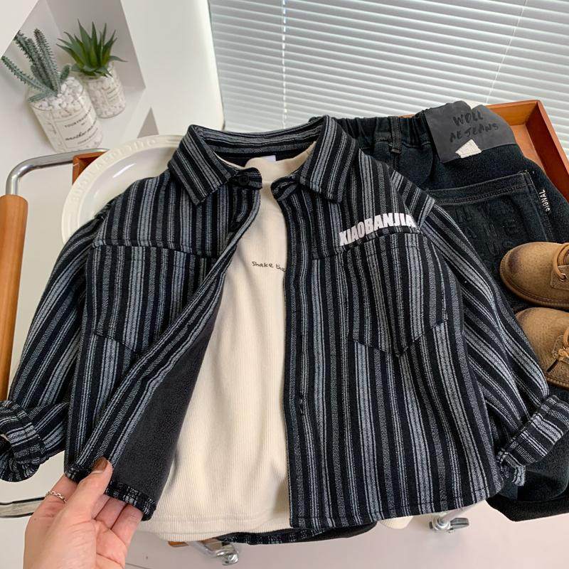 男童加绒衬衫外套秋冬装时尚男孩帅气条纹衬衣儿童休闲一体绒上衣