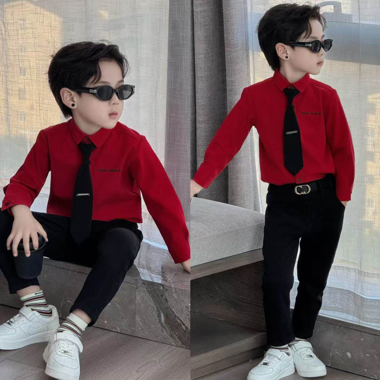 男童加绒衬衫韩版新款童装红色男童长袖百搭领带衬衣过年冬装上衣