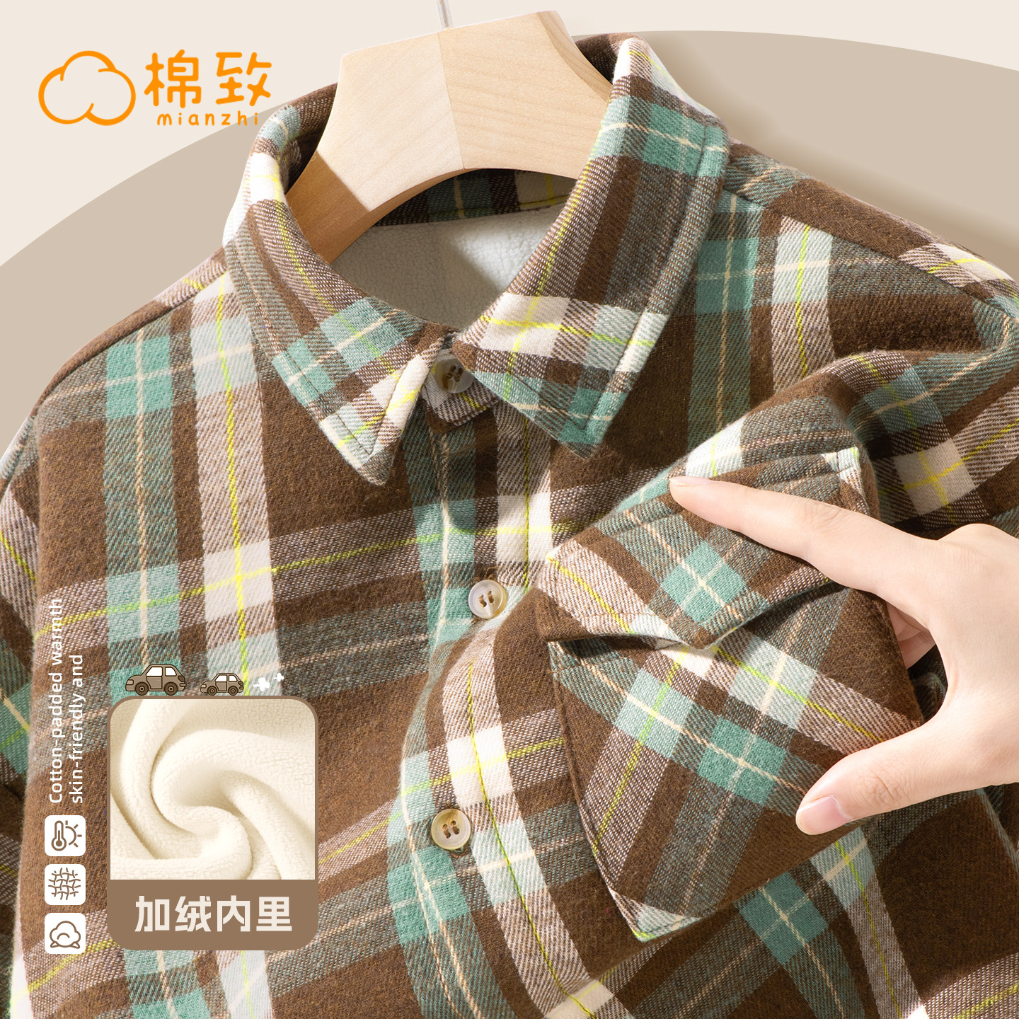 棉致男童加绒衬衫2025新款秋冬薄绒格子衬衫男大童上衣儿童外套冬
