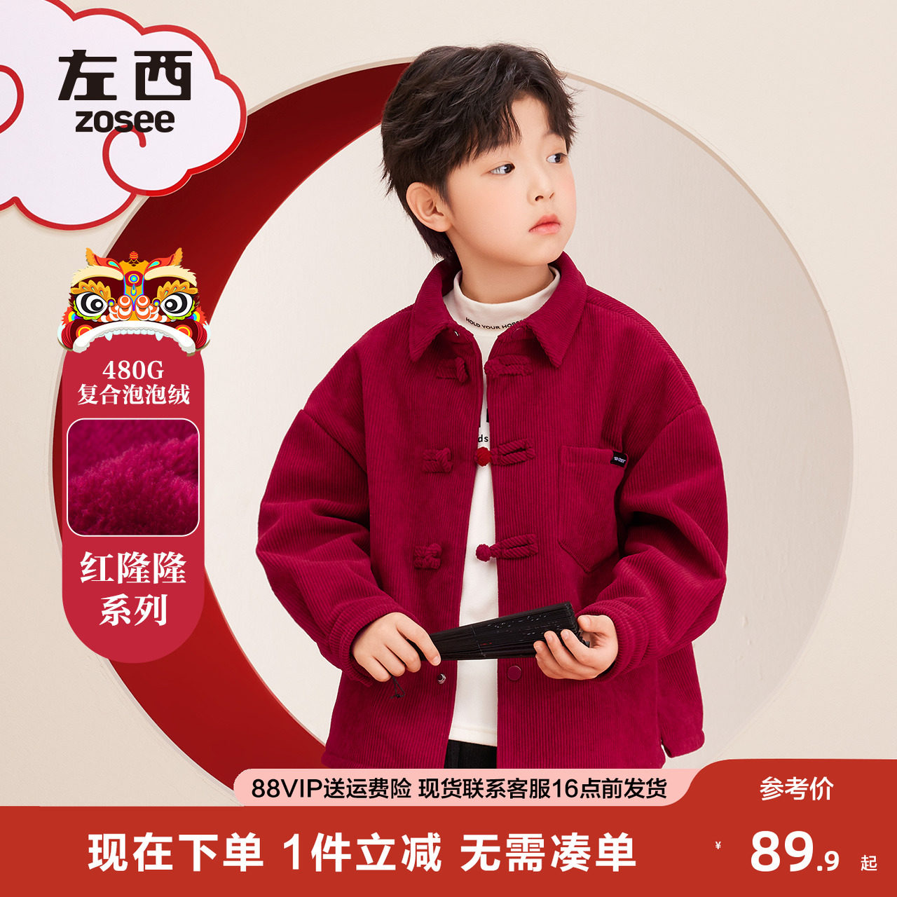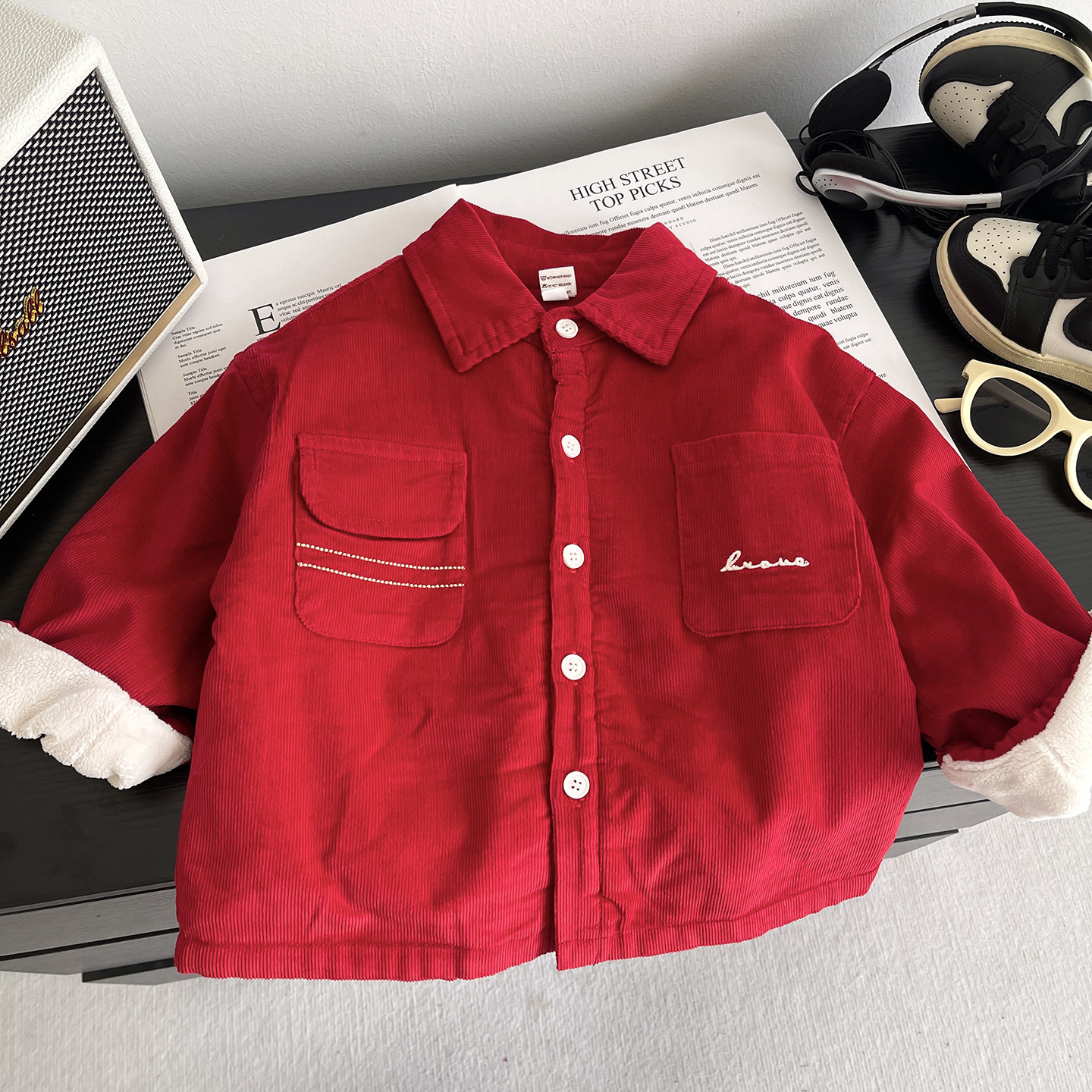 左西童装男童加绒衬衫加厚儿童冬季灯芯绒秋冬款2025新款红色拜年