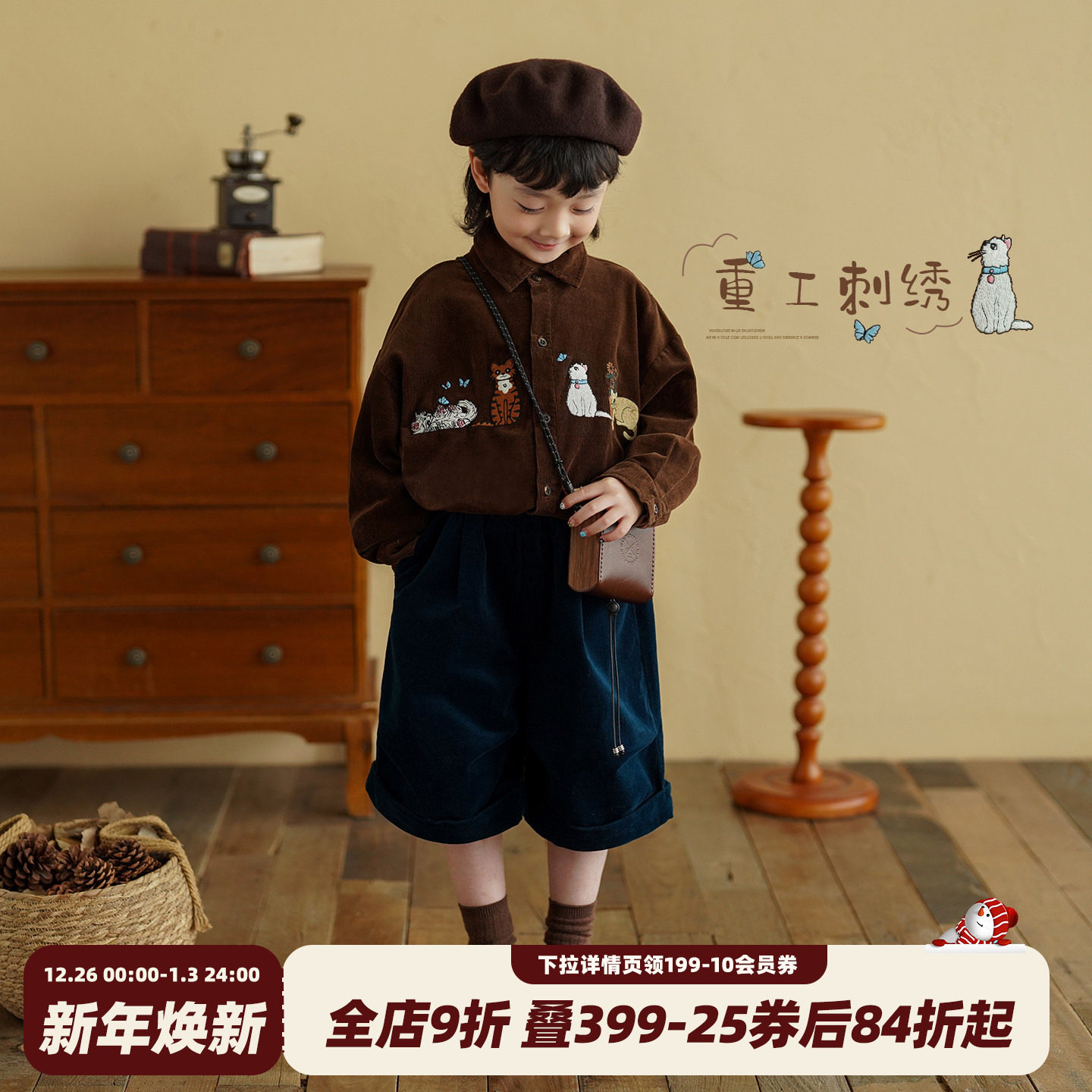 砚台家男童加绒衬衫秋季新款复古儿童重工刺绣长袖衬衣灯芯绒冬款