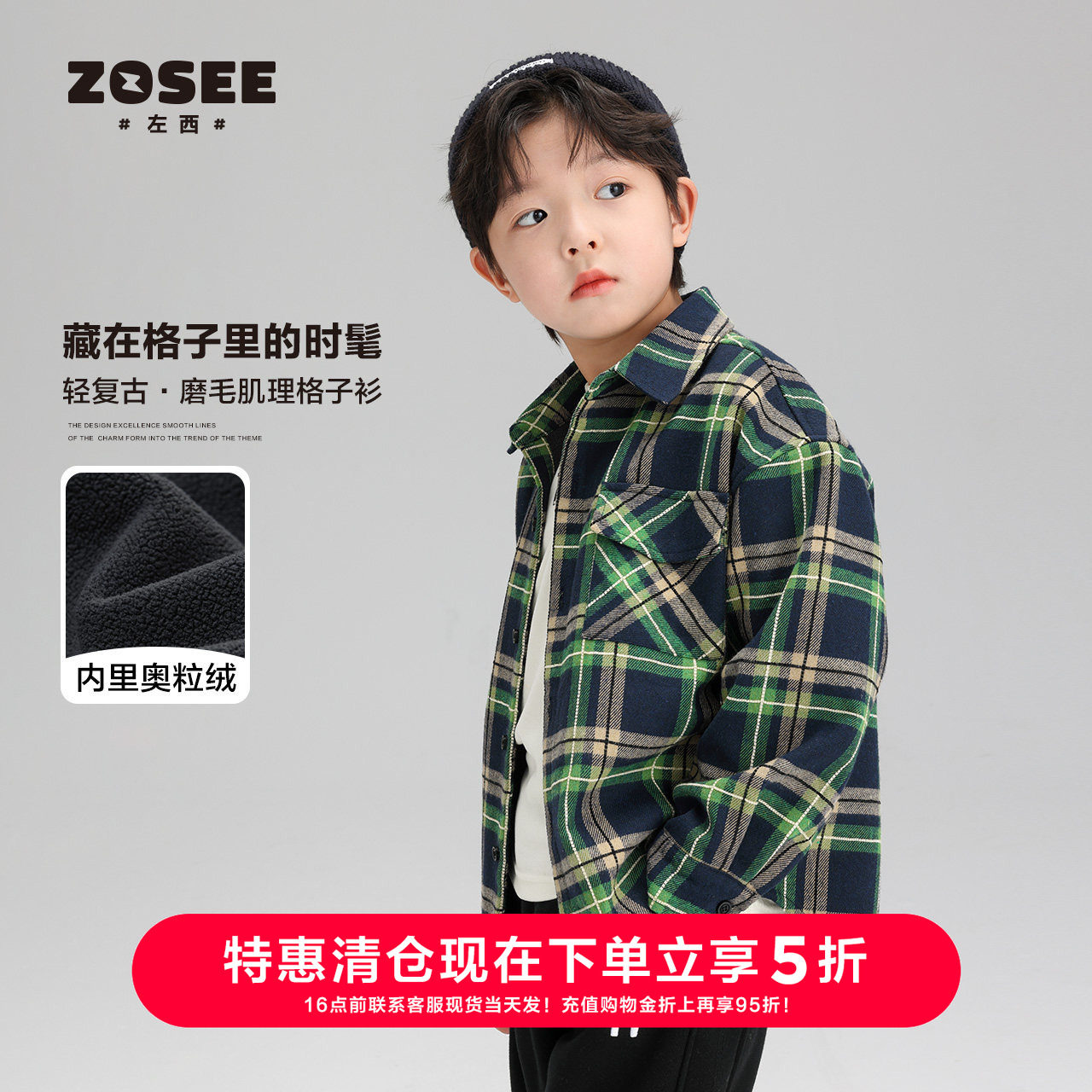 左西童装男童加绒衬衫秋冬款儿童格子外套2023新款洋气男孩潮