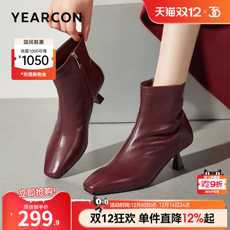 意尔康女鞋2025冬季真皮法式短靴细跟气质显瘦单靴及踝靴女士皮鞋