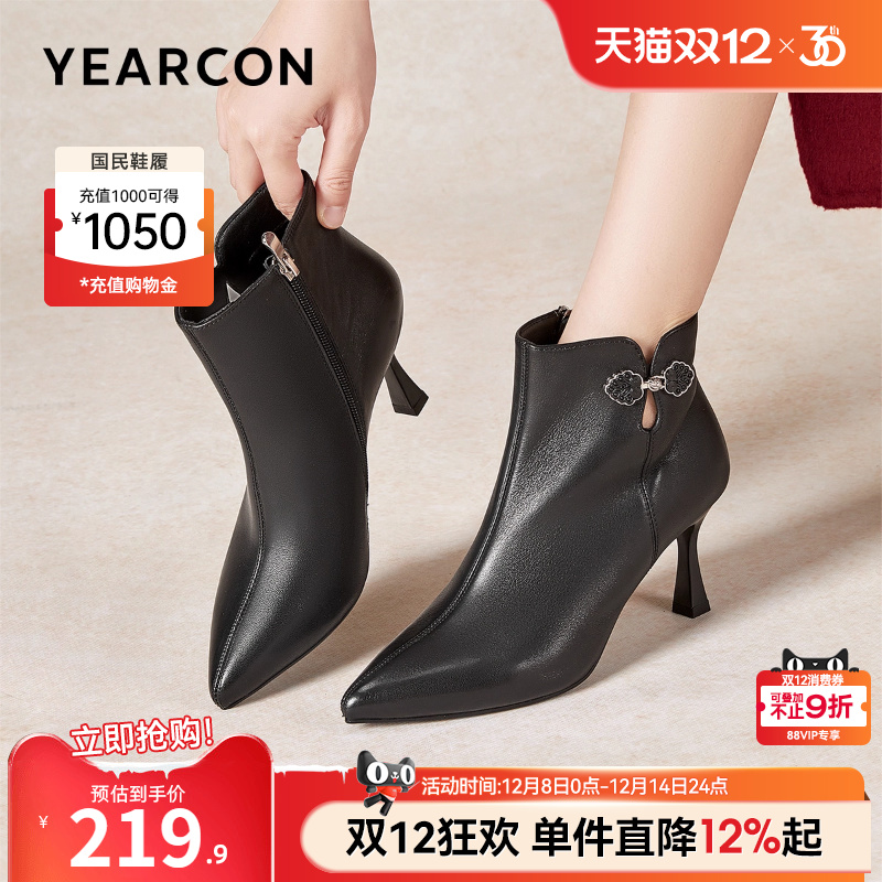 意尔康女鞋冬季真皮加绒短靴羊皮尖头细跟法式气质及踝靴女士皮鞋
