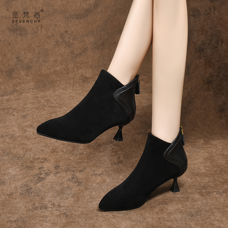 2025新款秋冬法式尖头绒面小跟短靴及踝靴细跟高跟鞋裸靴女真皮鞋