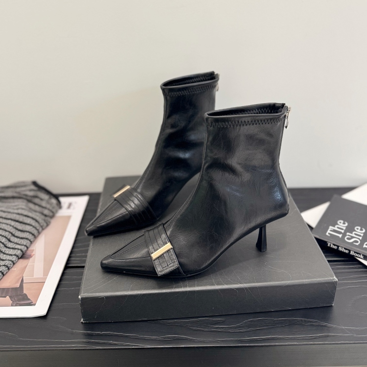 巴黎职场~秋冬新款洋气显瘦套筒尖头细跟ol通勤女及踝靴高跟短靴