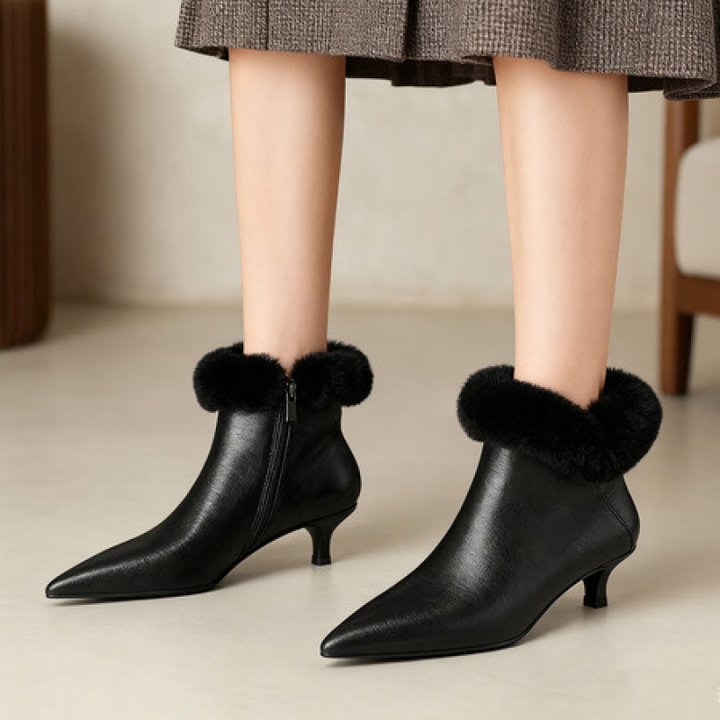 真皮法式气质小跟短靴女秋冬尖头兔毛加绒及踝靴细跟猫跟毛毛靴子