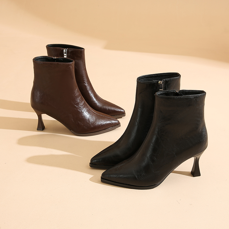 短靴女尖头2025秋冬新款侧拉链软皮舒适百搭及踝靴细跟时尚高跟鞋
