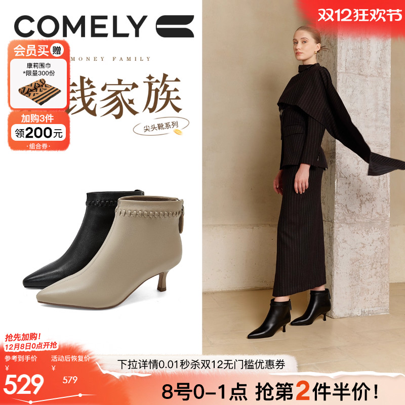 康莉真皮细跟时装靴2025冬季新款时尚尖头气质百搭通勤短靴及踝靴