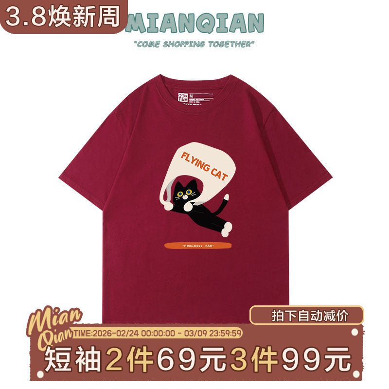棉牵别致小众设计感印花酒红色正肩短袖t恤女夏纯棉宽松半袖ins潮