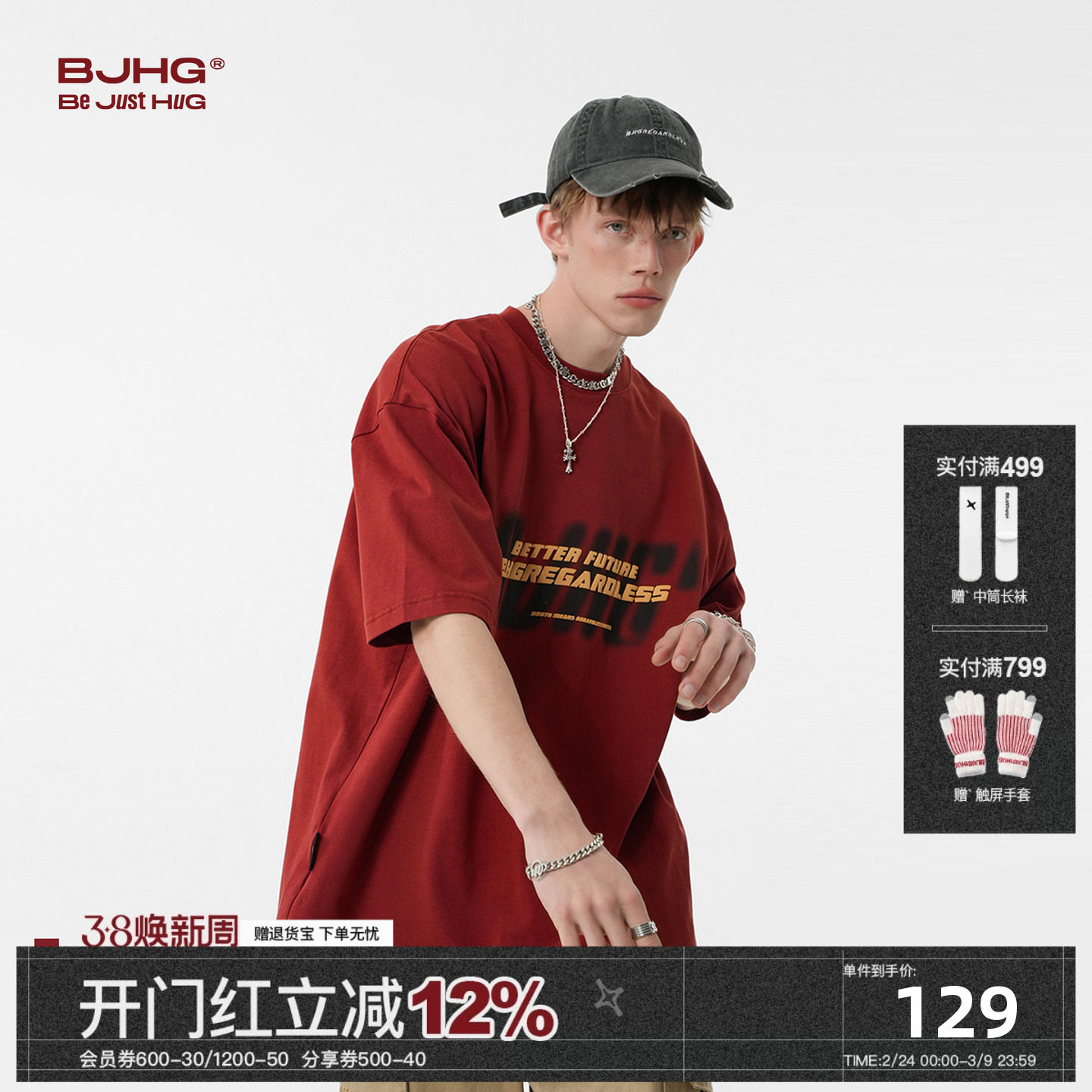 BJHG不计后果夏季 重磅美式酒红色纯棉短袖T恤男潮宽松情侣体恤女