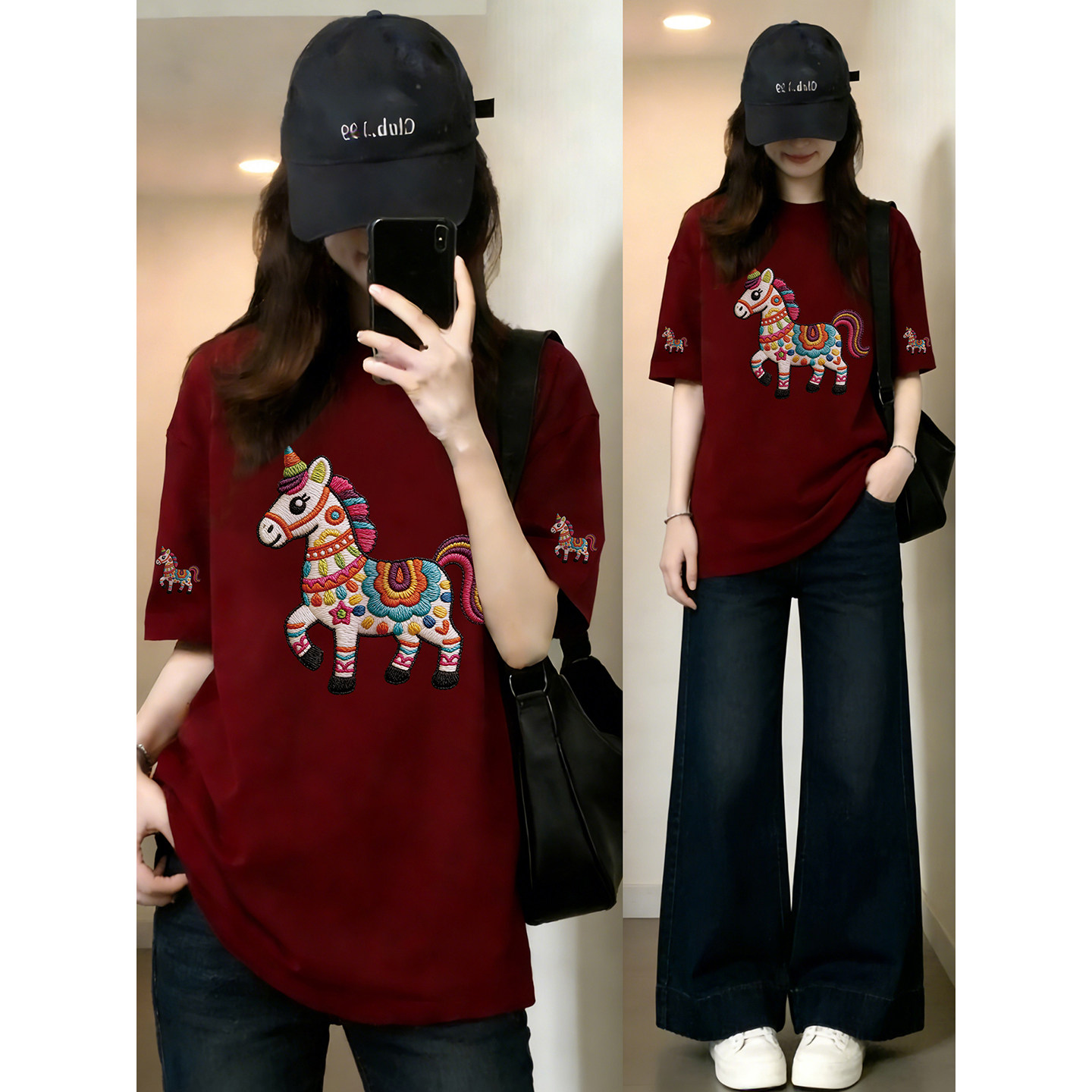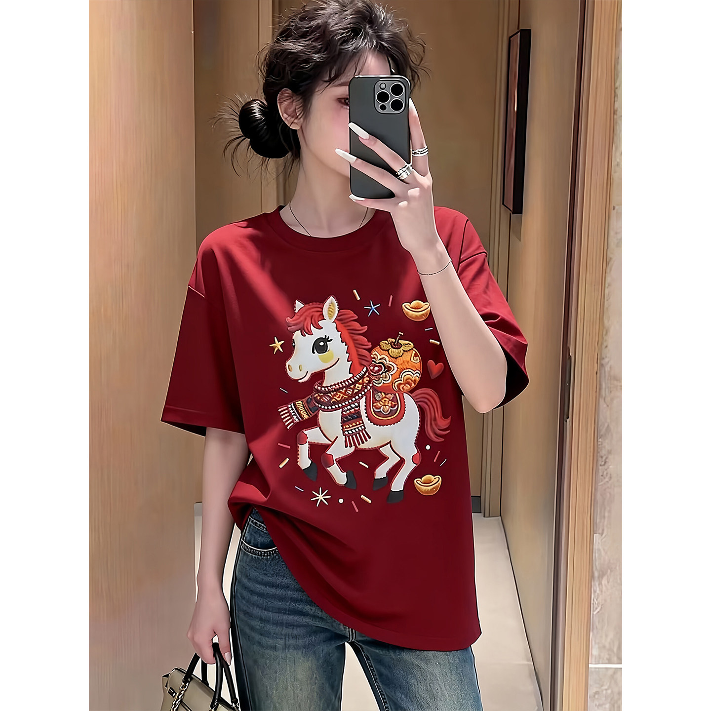 2026新款纯棉酒红色短袖t恤女小马前后印花宽松大码本命年上衣服