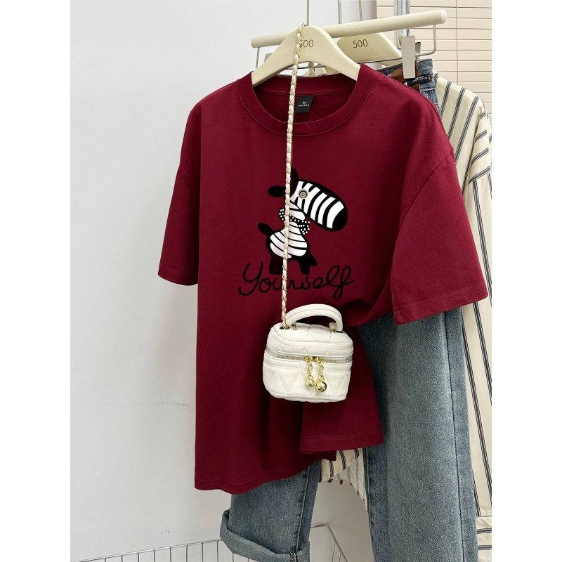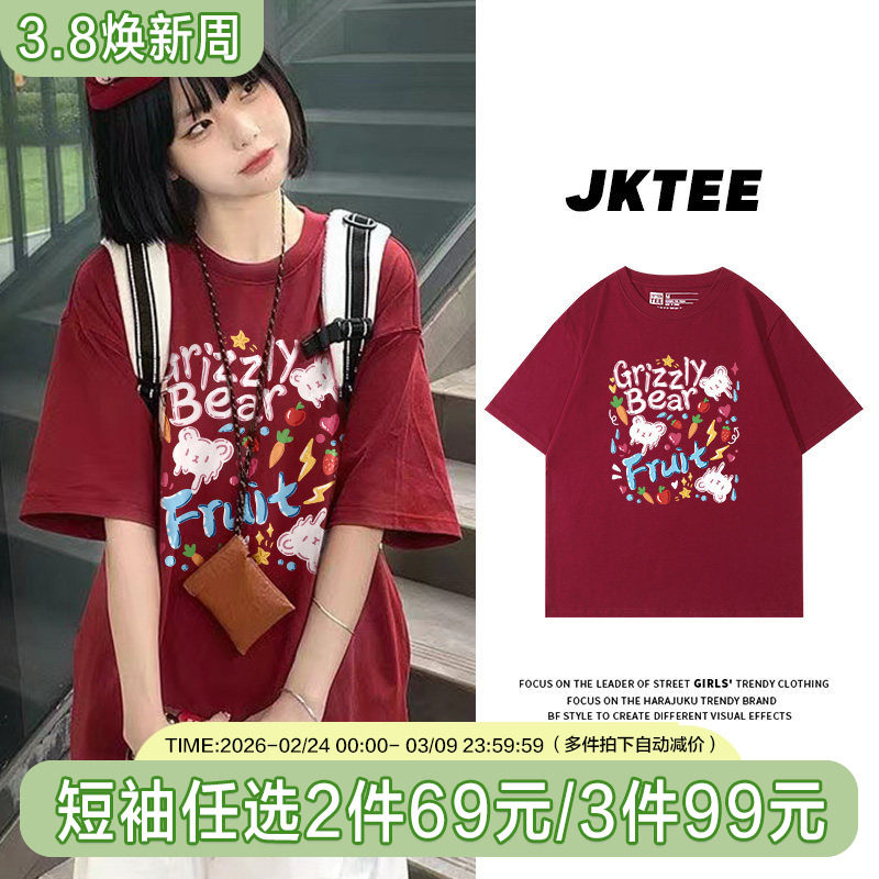 2026新年款可爱风减龄卡通印花酒红色短袖t恤女宽松韩版正肩上衣