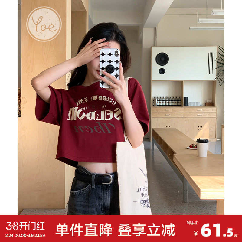 yoe短袖t恤女酒红色美式复古夏季新款小个子短款上衣宽松女装独特