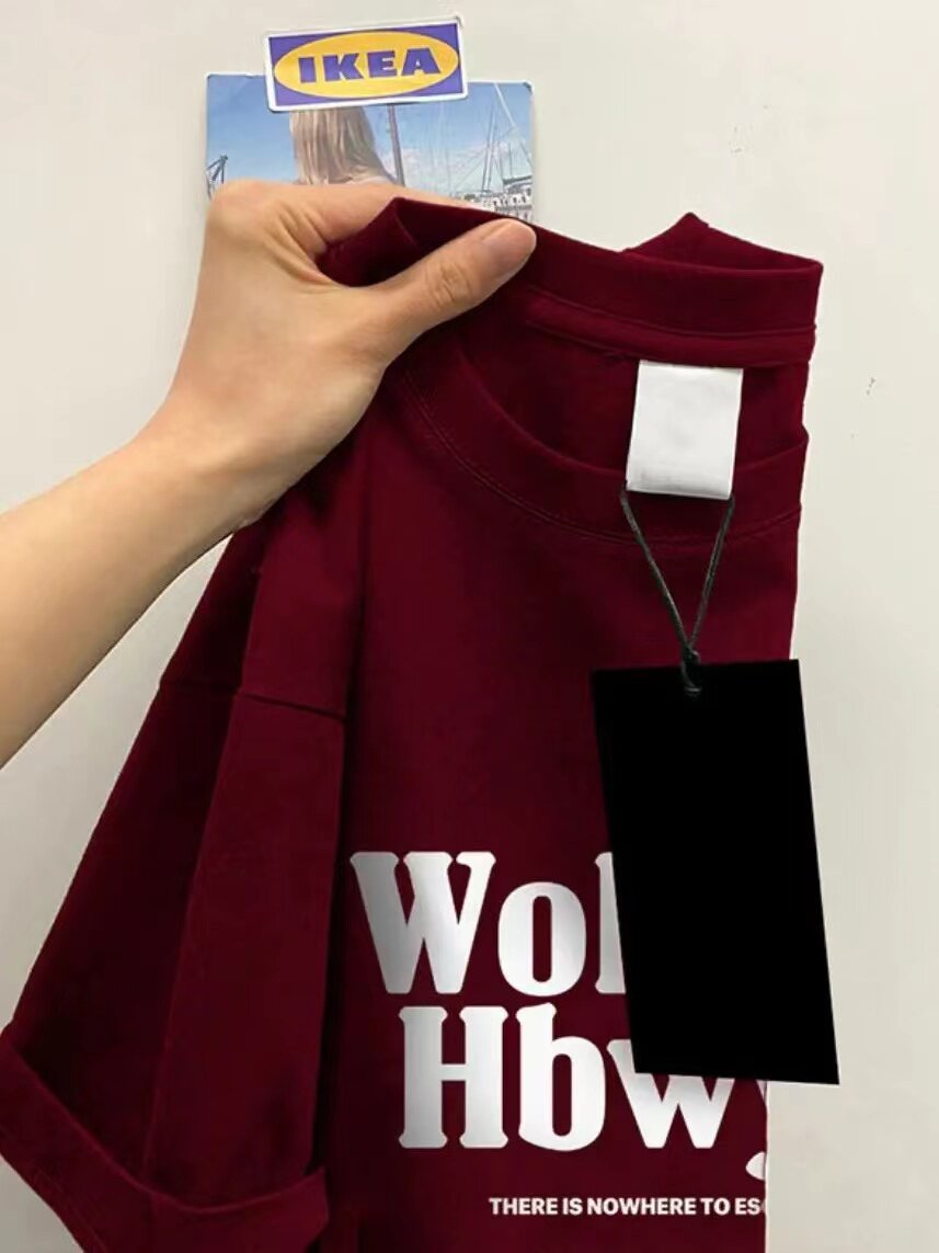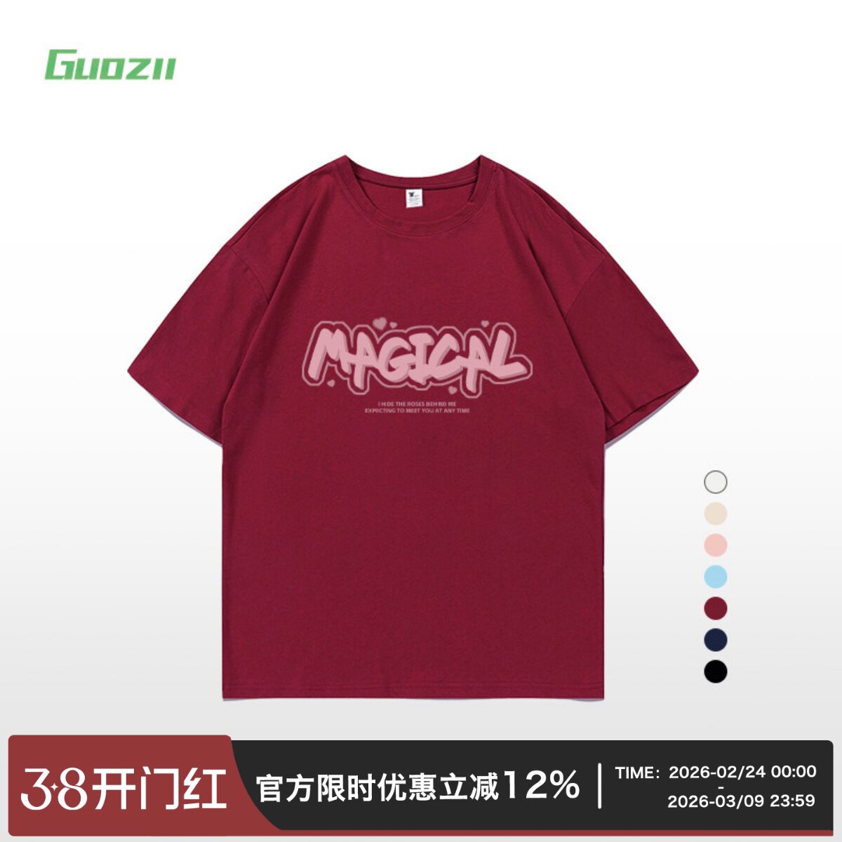 Guozii酒红色显白正肩短袖t恤女男字母印花240g纯棉宽松休闲上衣