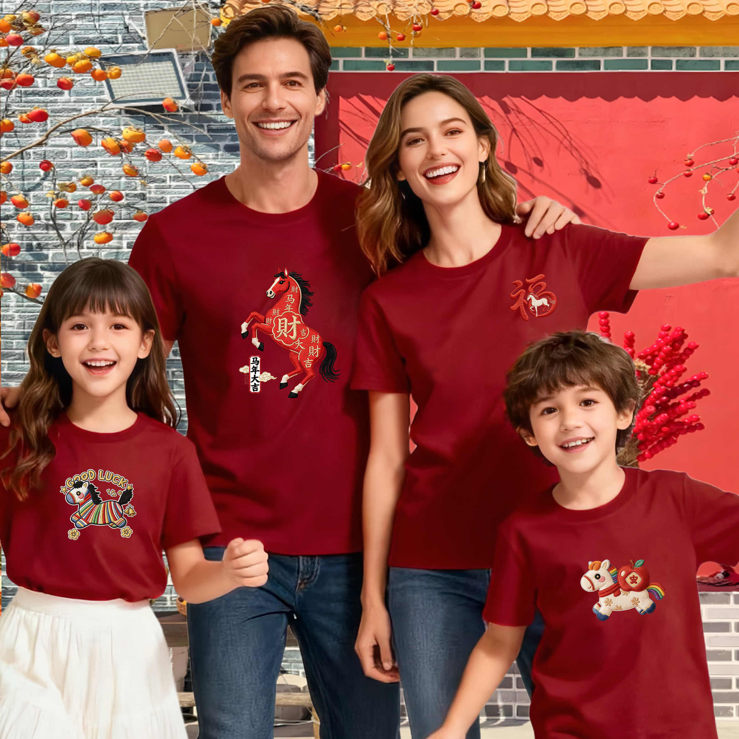 2026马年过年酒红色仿真刺绣短袖T恤男女亲子装宽松跨年纯棉衣服