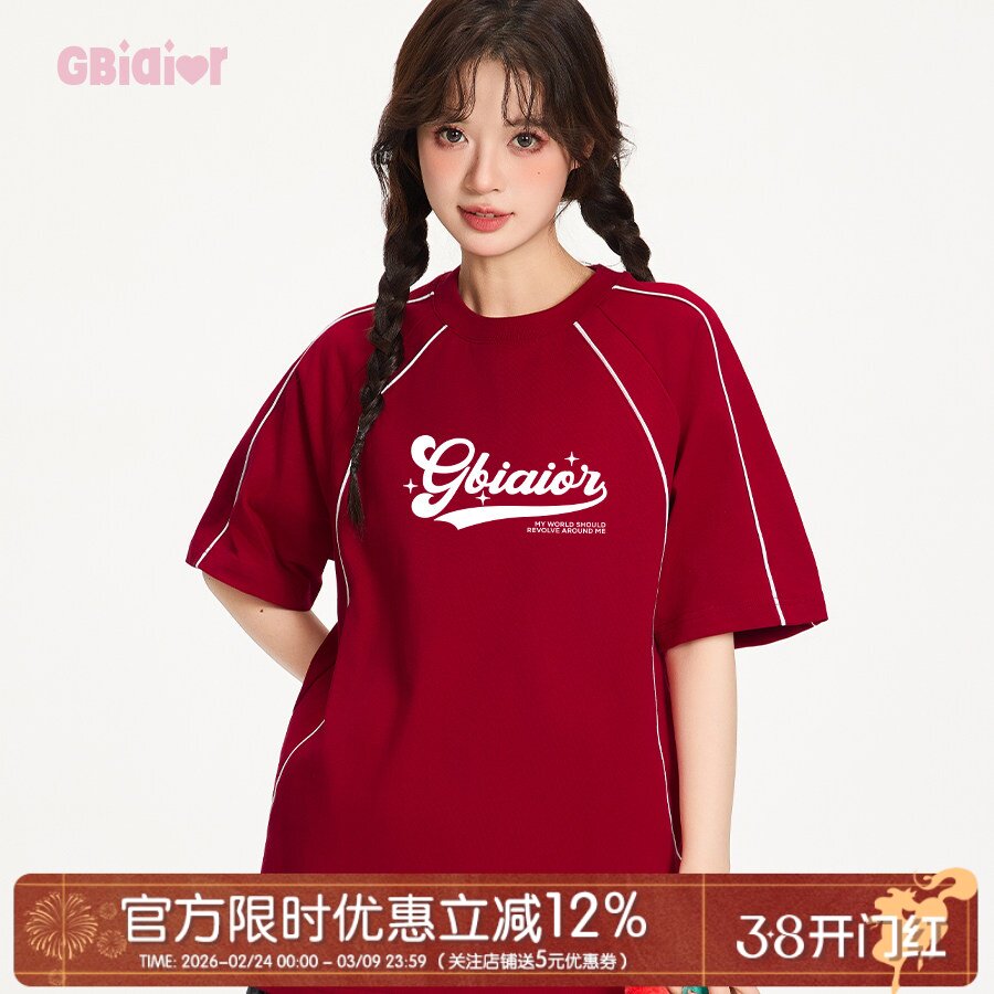 Gbiaior美式重磅酒红色显白休闲宽松短袖t恤女男设计感拼接上衣潮