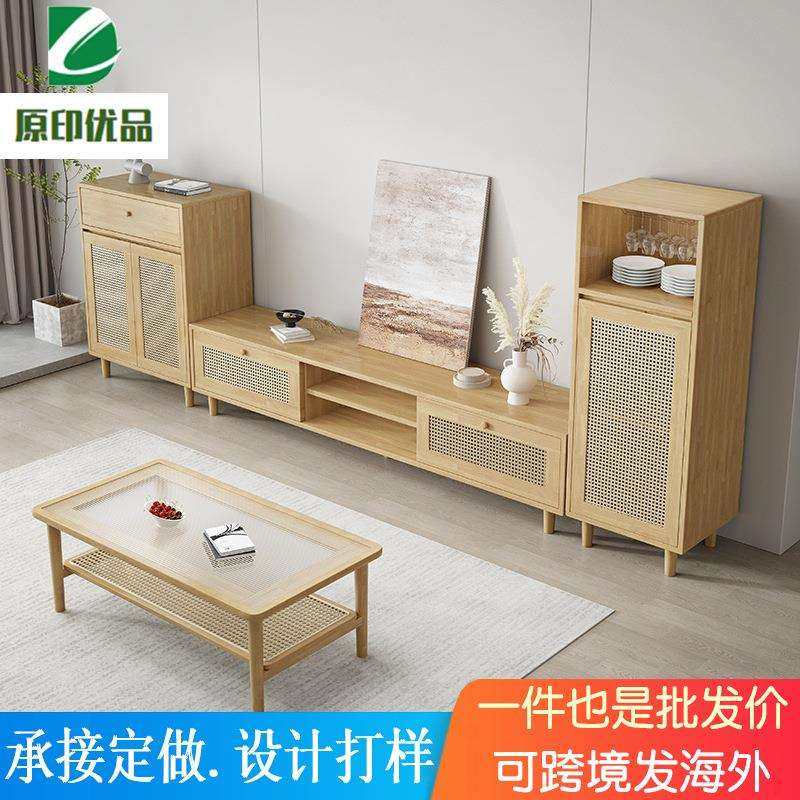 现代简约藤编茶几电视柜组合北欧客厅实木电视柜茶几2M落地电视柜