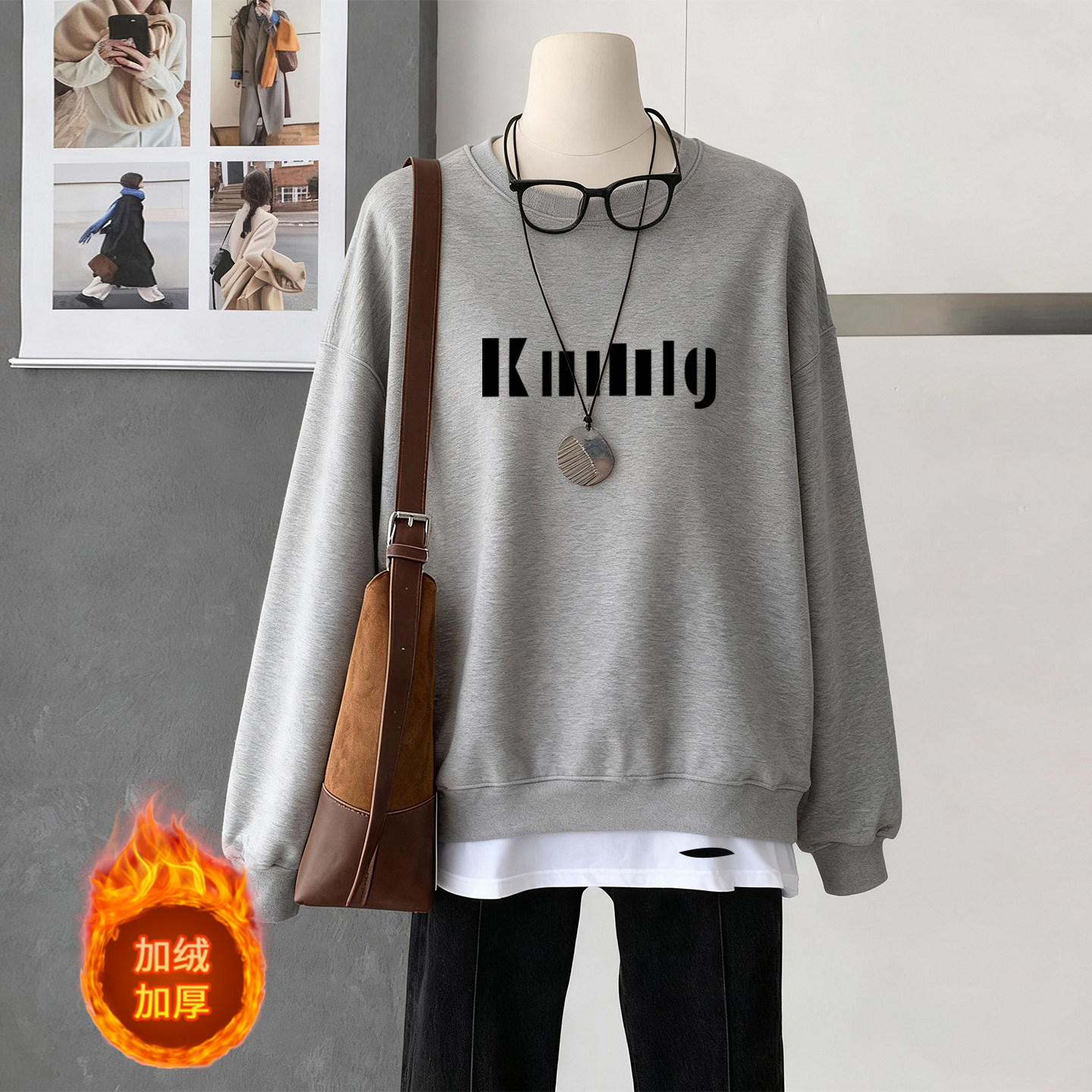 特价加绒加厚卫衣女秋冬宽松韩版2025新款灰色假两件中长款冬季