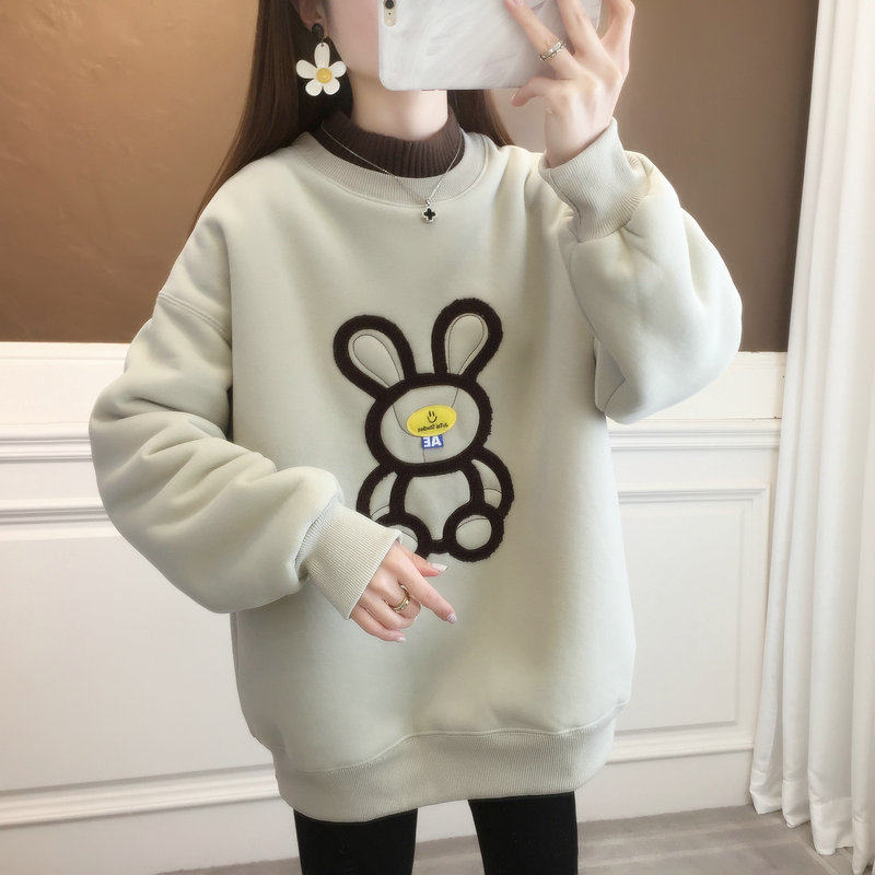 3758奇奇蒂蒂刺绣加绒加厚假两件韩版圆领显瘦通勤卫衣宽松套头女
