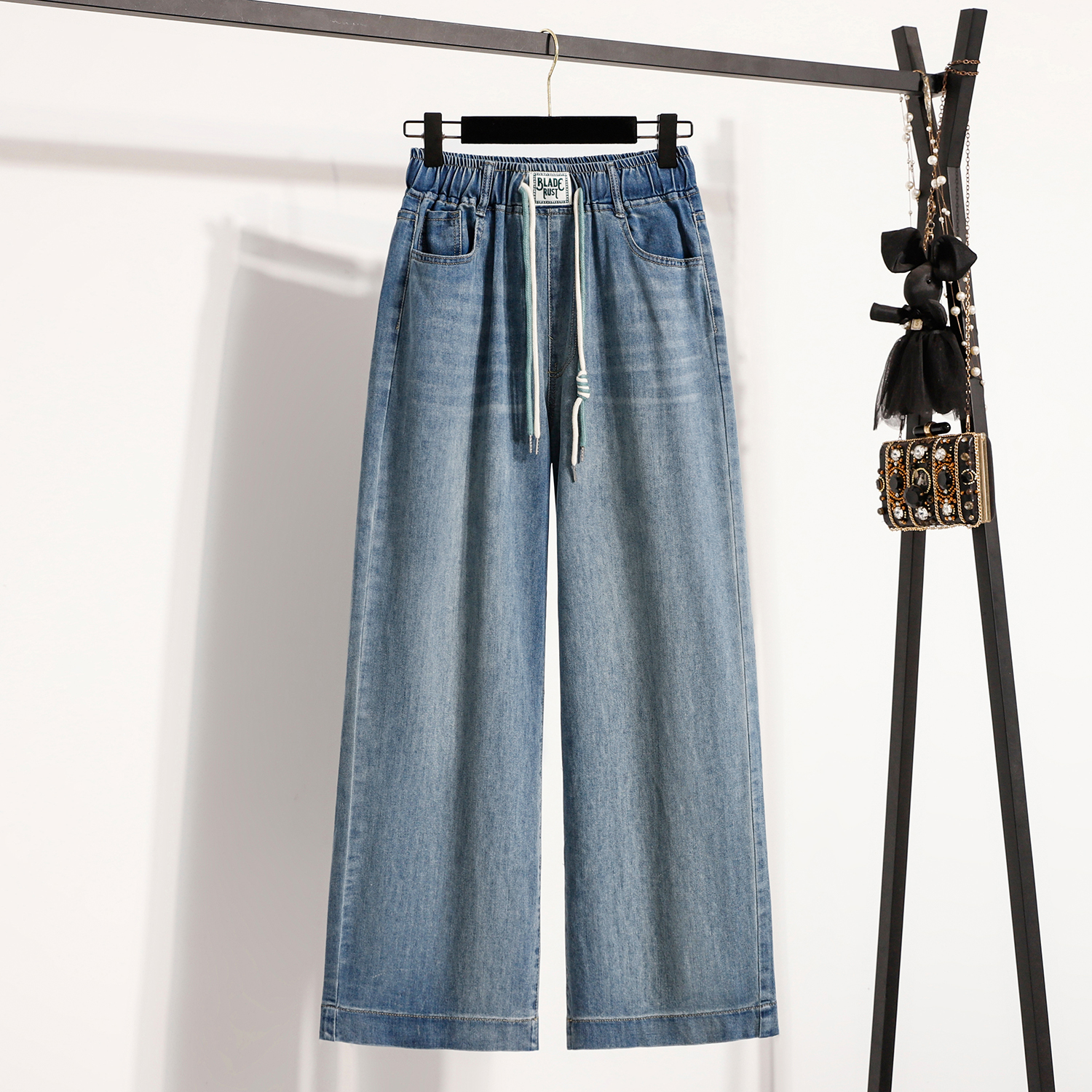 大码女装宽松显瘦百搭牛仔阔腿长裤子浅色 松紧腰抽绳腰带直筒裤