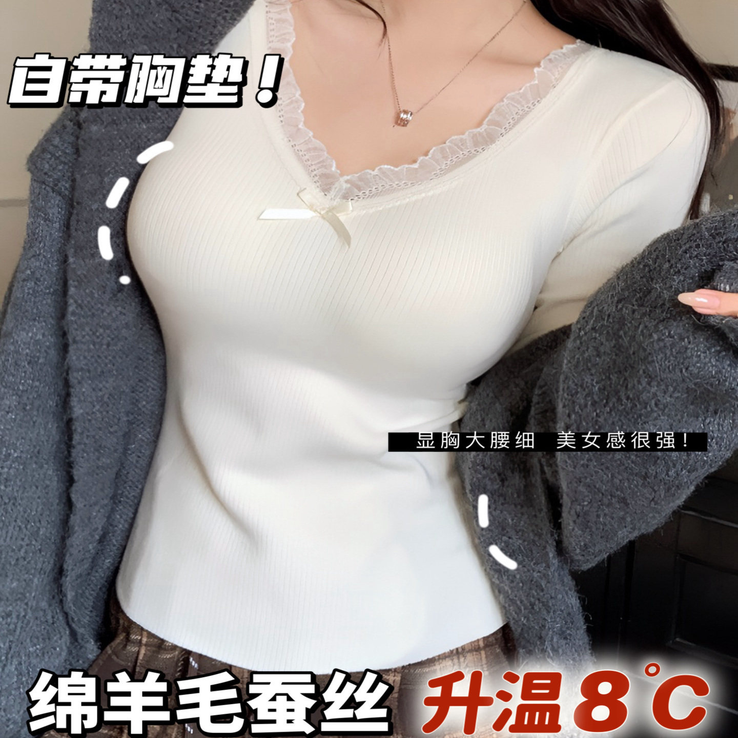 蕾丝花边v领保暖打底衫女秋冬季修身加绒内搭纯欲带胸垫蚕丝上衣