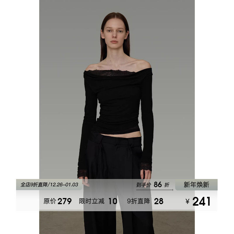 UNSPOKEN蕾丝拼接一字肩针织衫女2025秋季新款简约高级感修身上衣
