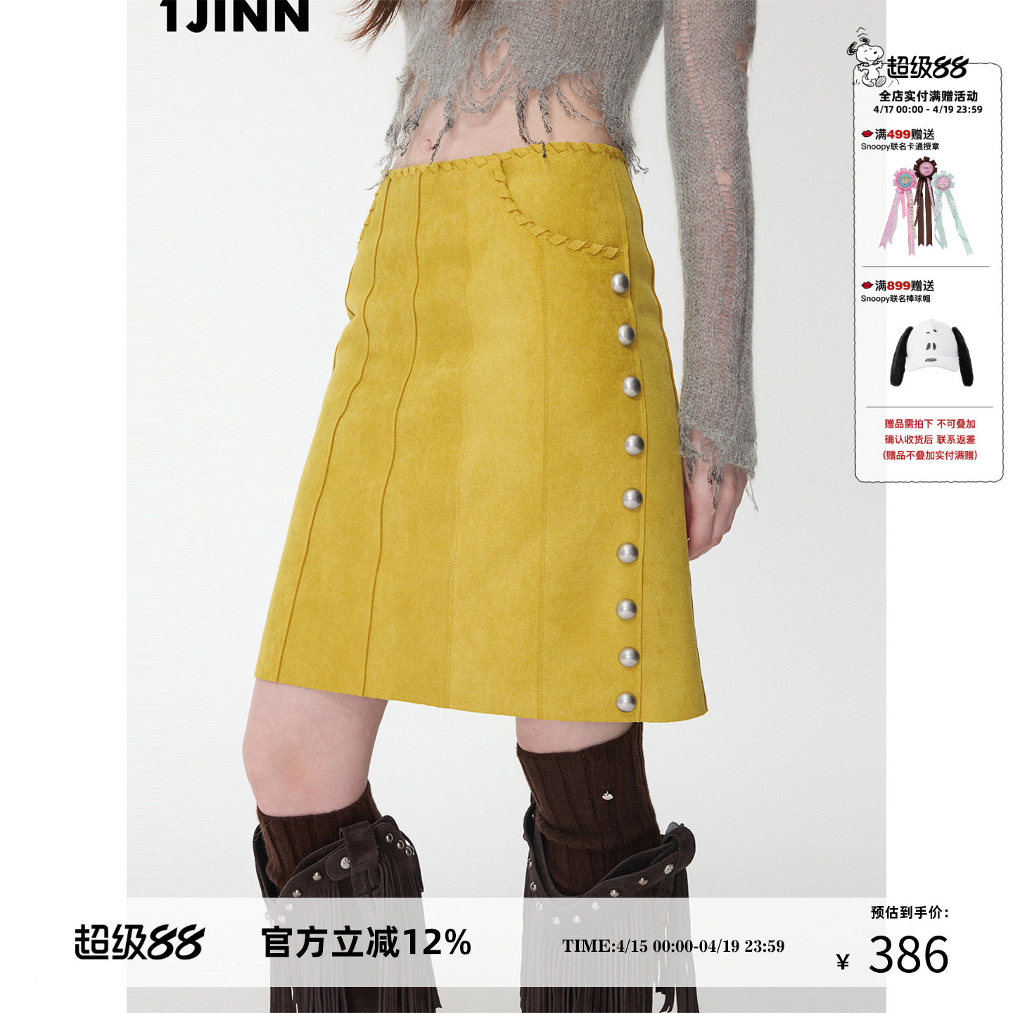 1JINN STUDIO 复古麂皮铆钉高腰A字中裙女腰头穿绳设计感半身裙