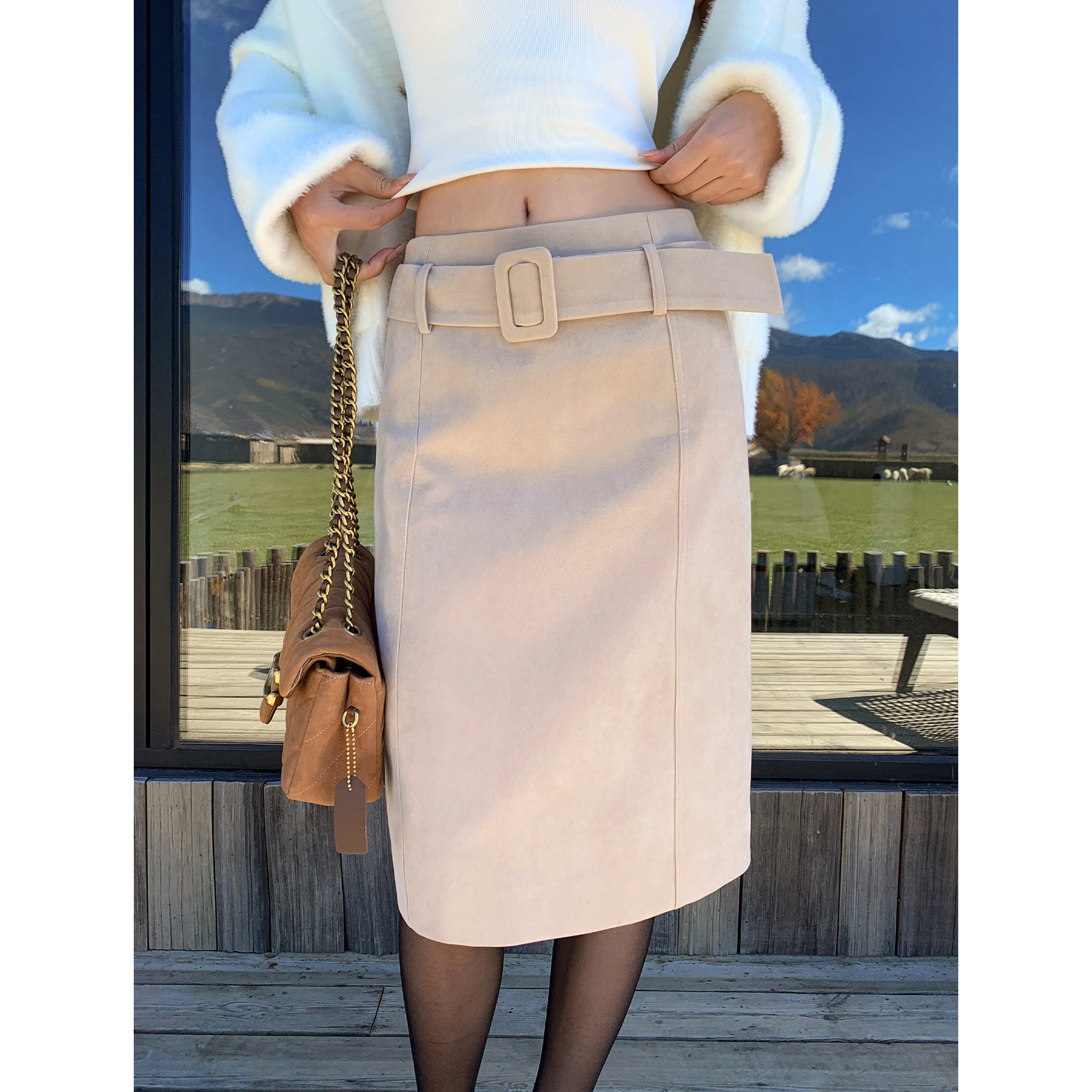 MULVAN 日落长河 复古麂皮高腰半身裙女可拆腰带咖色气质直筒中裙