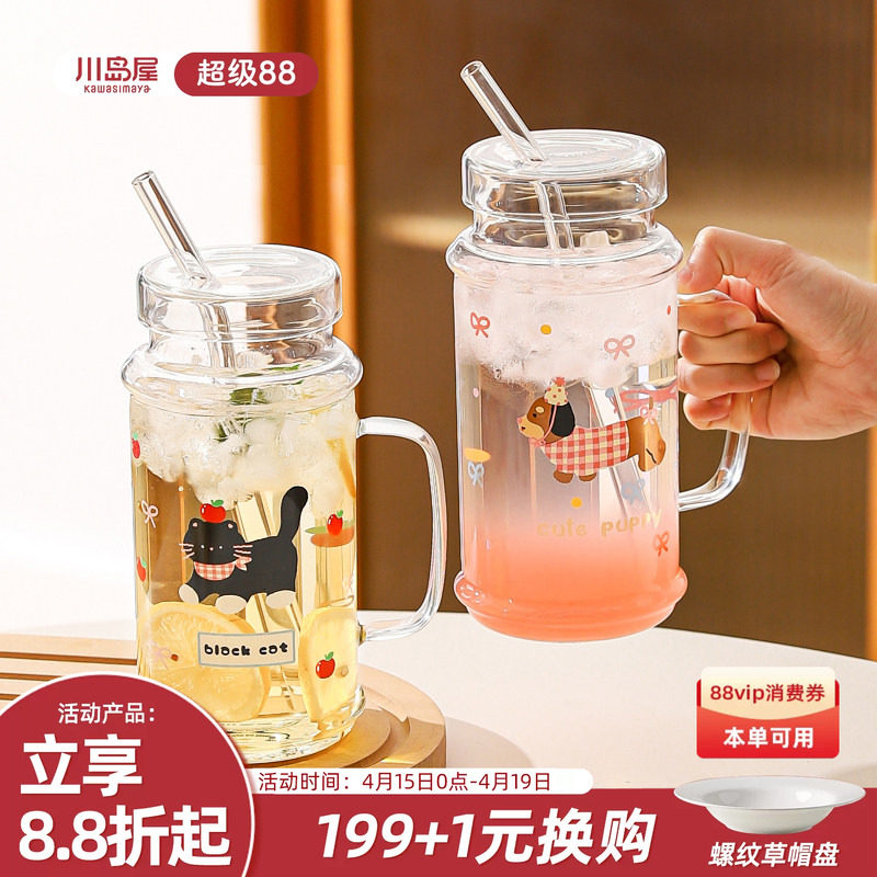 川岛屋高硼硅玻璃杯女高颜值耐高温带盖水杯家用大容量果汁吸管杯