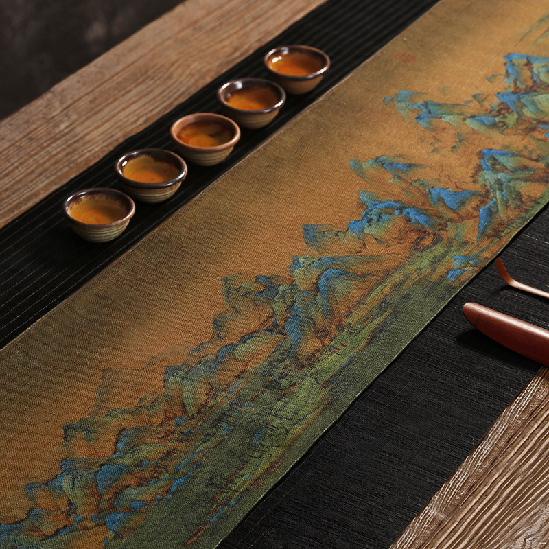 2米千里江山图 长茶席茶道茶桌茶帘垫子茶布干泡禅意中式棉麻布艺
