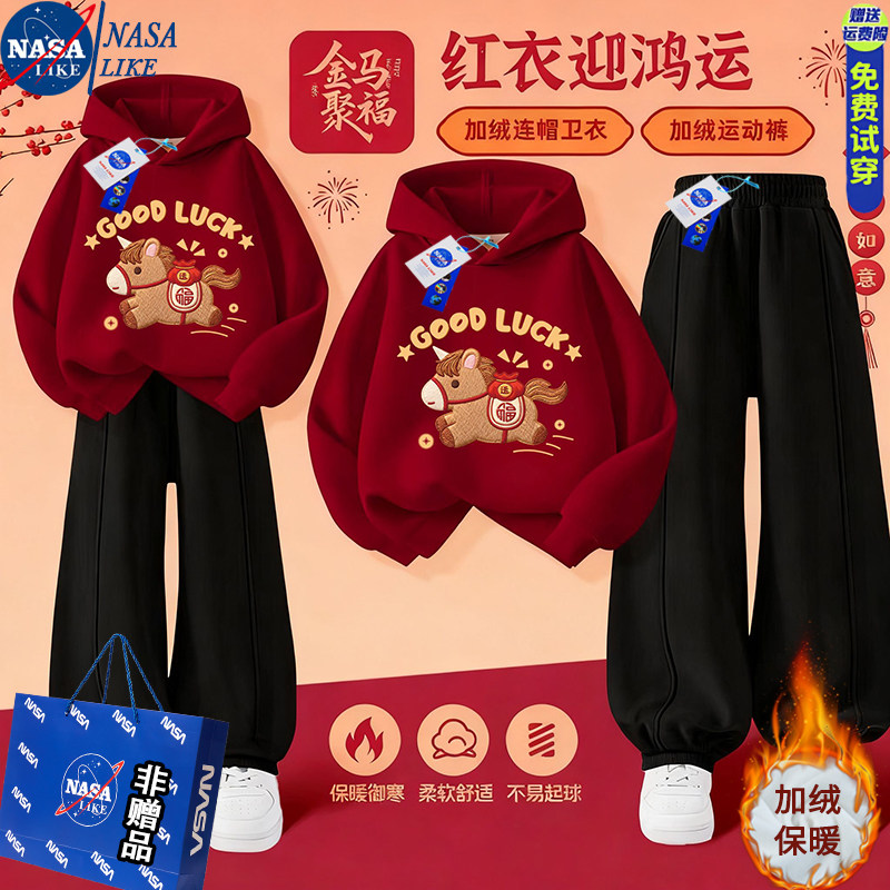 NASA红色拜年服儿童加绒卫衣卫衣运动套装秋冬季男女童休闲两件套