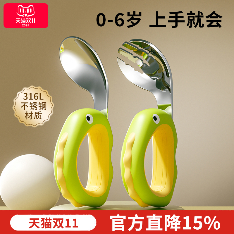 宝宝学吃饭训练自主进食勺子婴儿辅食扭扭弯曲头叉勺套装儿童餐具